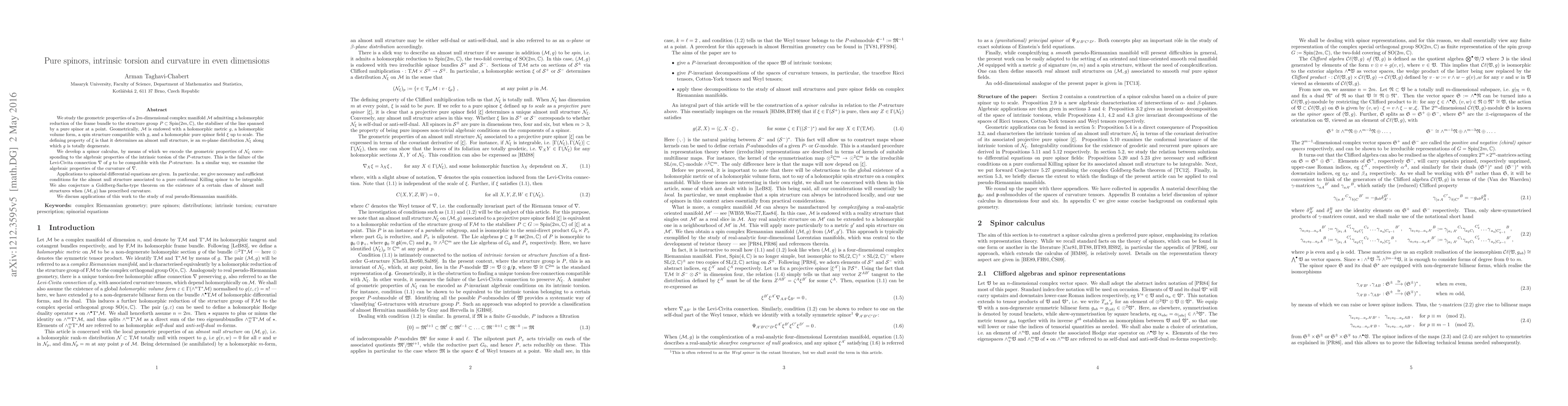 We study the geometric properties of a $2m$-dimensional complex manifold $\mathcal{M}$ admitting a holomorphic reduction of the frame bundle to the structure group $P \subset \mathrm{Spin}(2m,\mathbb{C})$, the stabiliser of the line spanned by a pure spinor at a point. Geometrically, $\mathcal{M}$ is endowed with a holomorphic metric $g$, a holomorphic volume form, a spin structure compatible with $g$, and a holomorphic pure spinor field $\xi$ up to scale. The defining property of $\xi$ is that it determines an almost null structure, ie an $m$-plane distribution $\mathcal{N}_\xi$ along which $g$ is totally degenerate. We develop a spinor calculus, by means of which we encode the geometric properties of $\mathcal{N}_\xi$ corresponding to the algebraic properties of the intrinsic torsion of the $P$-structure. This is the failure of the Levi-Civita connection $\nabla$ of $g$ to be compatible with the $P$-structure. In a similar way, we examine the algebraic properties of the curvature of $\nabla$. Applications to spinorial differential equations are given. In particular, we give necessary and sufficient conditions for the almost null structure associated to a pure conformal Killing spinor to be integrable. We also conjecture a Goldberg-Sachs-type theorem on the existence of a certain class of almost null structures when $(\mathcal{M},g)$ has prescribed curvature. We discuss applications of this work to the study of real pseudo-Riemannian manifolds.