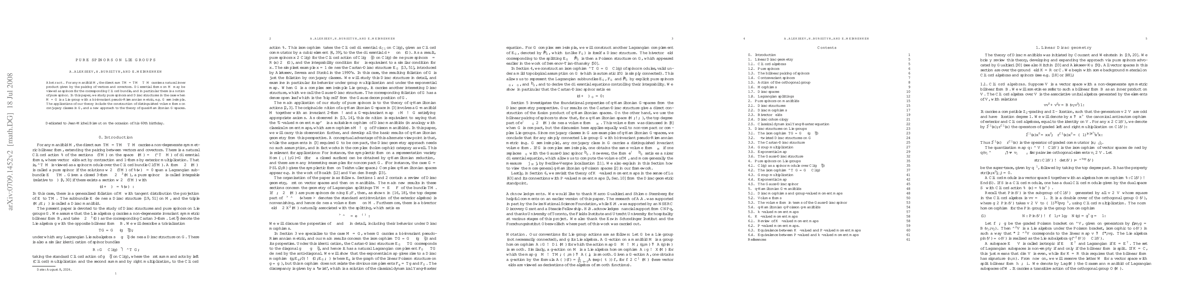 This paper explores pure spinors and Dirac structures on Lie groups with bi-invariant pseudo-Riemannian metrics, particularly for semi-simple groups. It presents methods for constructing distinguished volume forms on conjugacy classes and a novel approach to quasi-Hamiltonian G-spaces.