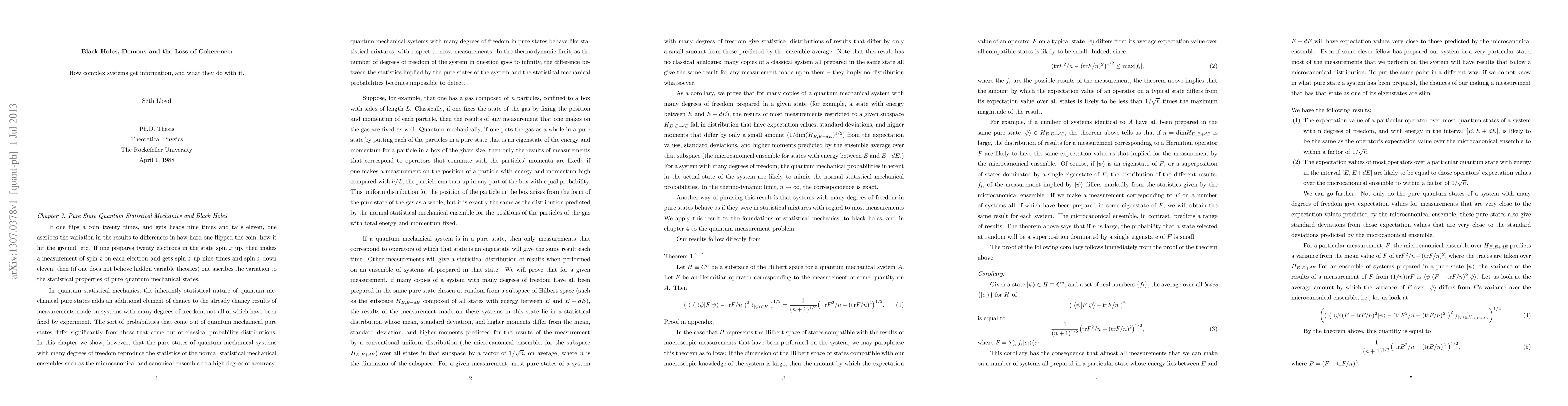 Chapter 3 of S. Lloyd's 1988 Ph.D. thesis, `Black Holes, Demons, and the Loss of Coherence: How complex systems get information and what they do with it,' supervisor Heinz Pagels. Reformulates statistical mechanics in terms of pure states and shows that (a) quantum statistics of typical pure states are very close to the mechanics of statistical mechanical ensembles; (b) if a system is in a typical state with energy E, then the reduced density matrix of a subsystem is very close to a thermal state. (A similar result was derived using Levy's lemma some years later by S. Popescu, A.J. Short, A.Winter, Nature Physics 2, 754-758 (2006).) Pure state quantum statistical mechanics is applied to black holesto show that for typical states of matter insideand outside a black hole, the external state is likely to be thermal. Proposes novel interpretation of probabilities in quantum statistical mechanics. Full thesis available at http://meche.mit.edu/documents/slloyd_thesis.pdf. This chapter was submitted for publication to Physical Review in 1988 but rejected by one sentence referee report: `There is no physics in this paper.' You be the judge.