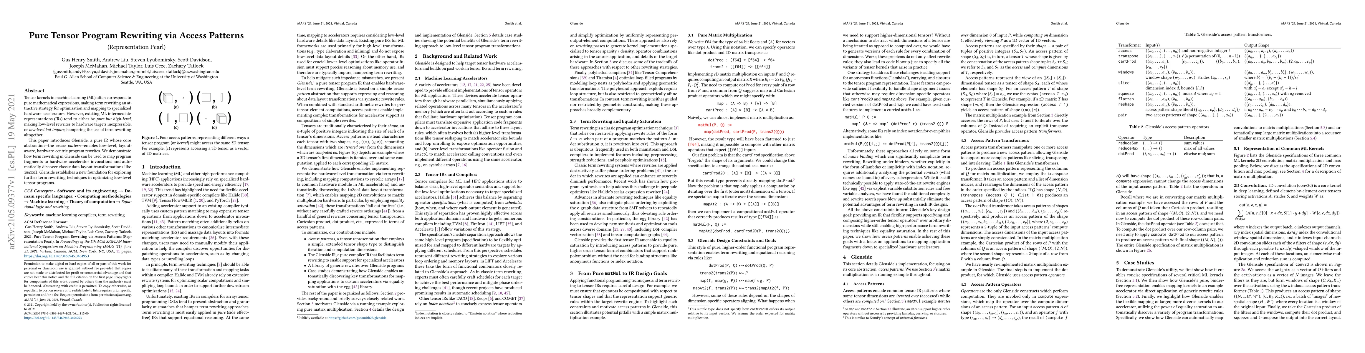 This paper introduces Glenside, a pure intermediate representation (IR) for tensor kernels in machine learning, focusing on the concept of access patterns to enable low-level, hardware-centric program rewrites. Glenside facilitates term rewriting for optimization and mapping to hardware accelerators, discovering data layout transformations like im2col.