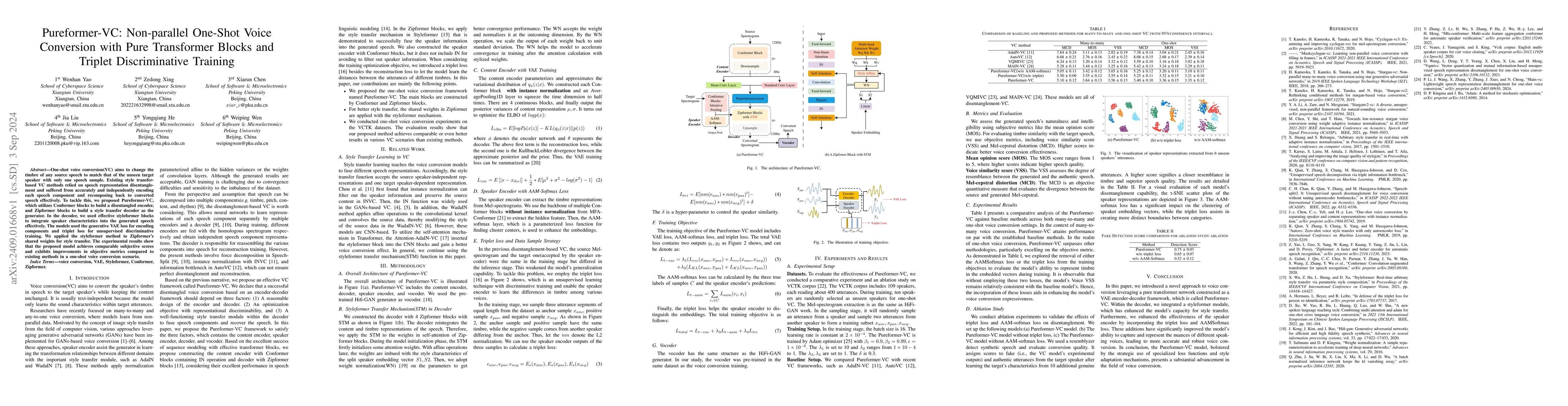 Pureformer-VC employs Conformer and Zipformer blocks for disentangled encoding and style transfer in one-shot voice conversion, using generative VAE and triplet discriminative training for enhanced performance, showing improvements over existing methods.