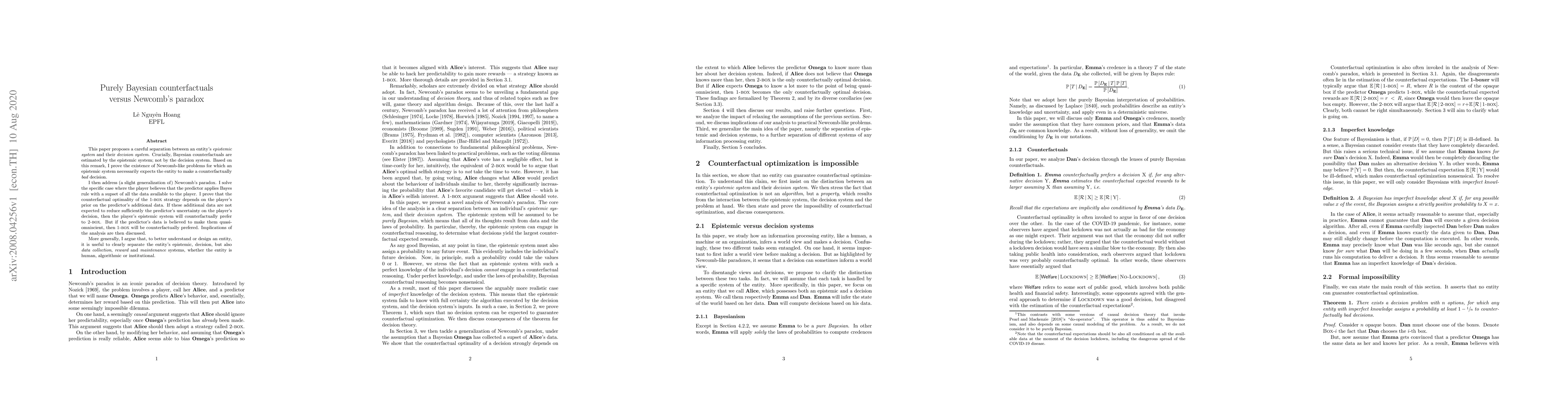 This paper proposes a careful separation between an entity's epistemic system and their decision system. Crucially, Bayesian counterfactuals are estimated by the epistemic system; not by the decision system. Based on this remark, I prove the existence of Newcomb-like problems for which an epistemic system necessarily expects the entity to make a counterfactually bad decision. I then address (a slight generalization of) Newcomb's paradox. I solve the specific case where the player believes that the predictor applies Bayes rule with a supset of all the data available to the player. I prove that the counterfactual optimality of the 1-Box strategy depends on the player's prior on the predictor's additional data. If these additional data are not expected to reduce sufficiently the predictor's uncertainty on the player's decision, then the player's epistemic system will counterfactually prefer to 2-Box. But if the predictor's data is believed to make them quasi-omniscient, then 1-Box will be counterfactually preferred. Implications of the analysis are then discussed. More generally, I argue that, to better understand or design an entity, it is useful to clearly separate the entity's epistemic, decision, but also data collection, reward and maintenance systems, whether the entity is human, algorithmic or institutional.
