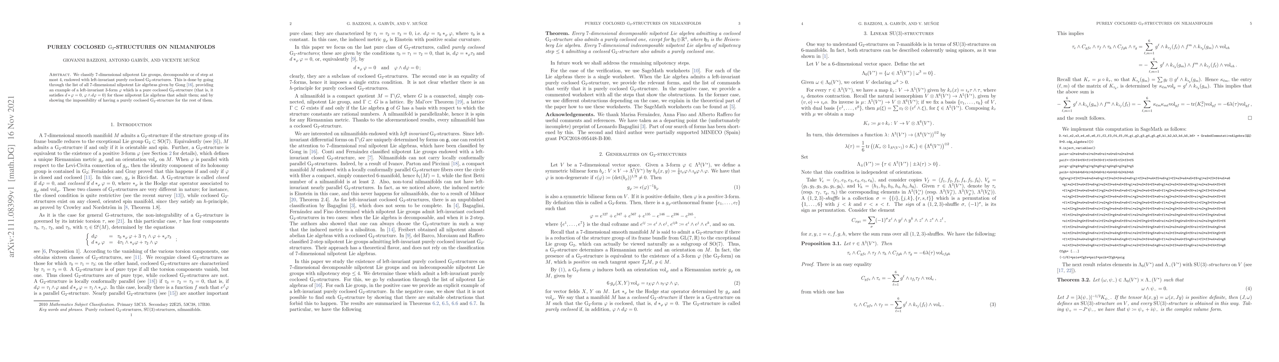 We classify 7-dimensional nilpotent Lie groups, decomposable or of nilpotency step at most 4, endowed with left-invariant purely coclosed $G_2$-structures. This is done by going through the list of all 7-dimensional nilpotent Lie algebras given by Gong, providing an example of a left-invariant 3-form $\varphi$ which is a pure coclosed $G_2$-structure (that is, it satisfies $d*\varphi=0$, $\varphi \wedge d\varphi=0$) for those nilpotent Lie algebras that admit them; and by showing the impossibility of having a purely coclosed $G_2$-structure for the rest of them.