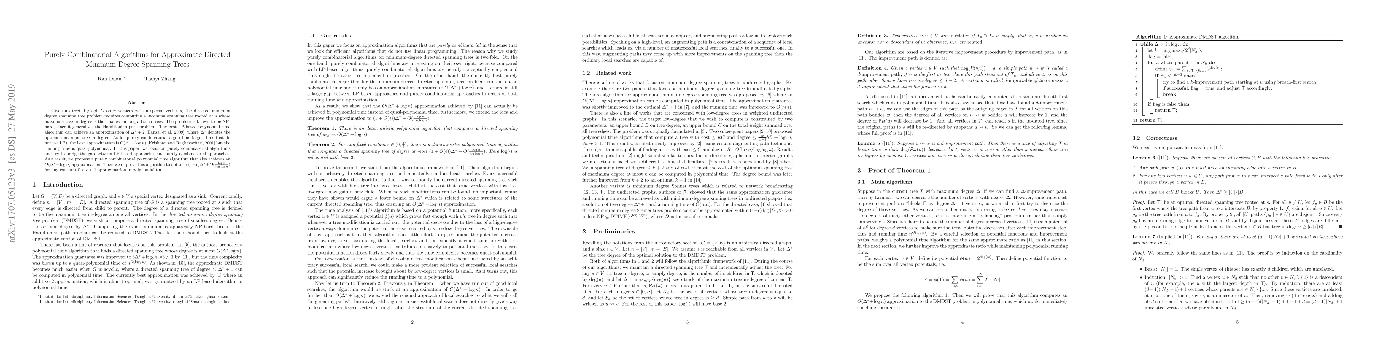 This paper presents purely combinatorial algorithms for the directed minimum degree spanning tree problem, achieving an $O(\Delta^* + \log n)$ approximation in polynomial time. It further improves the algorithm to provide a $(1+\epsilon)\Delta^* + O(\frac{\log n}{\log\log n})$ approximation for any small $\epsilon > 0$ in polynomial time.