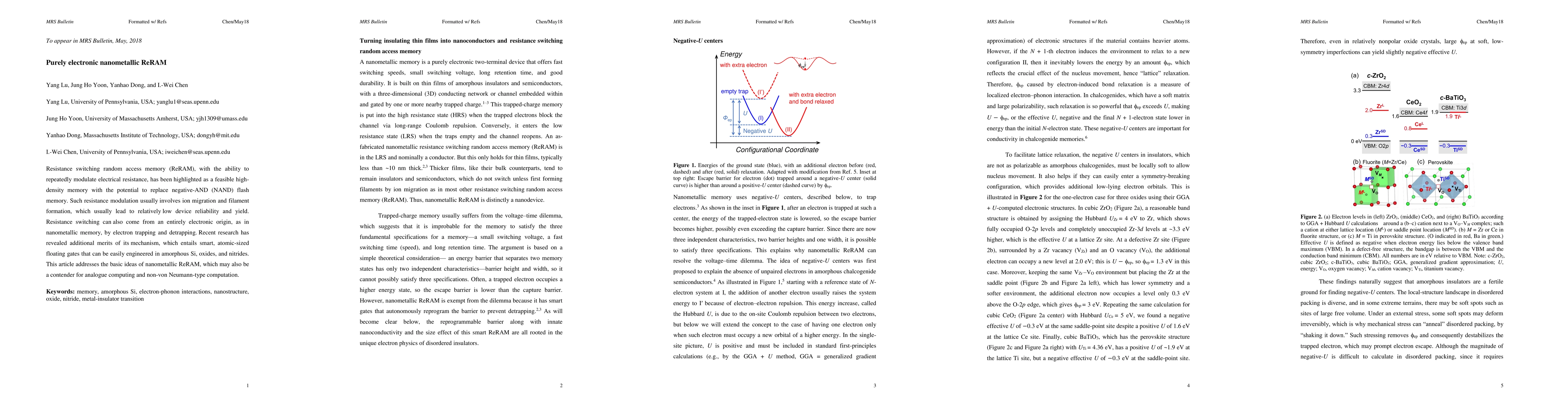 Resistance switching random access memory (ReRAM), with the ability to repeatedly modulate electrical resistance, has been highlighted as a feasible high-density memory with the potential to replace negative-AND (NAND) flash memory. Such resistance modulation usually involves ion migration and filament formation, which usually lead to relatively low device reliability and yield. Resistance switching can also come from an entirely electronic origin, as in nanometallic memory, by electron trapping and detrapping. Recent research has revealed additional merits of its mechanism, which entails smart, atomic-sized floating gates that can be easily engineered in amorphous Si, oxides, and nitrides. This article addresses the basic ideas of nanometallic ReRAM, which may also be a contender for analogue computing and non-von Neumann-type computation.