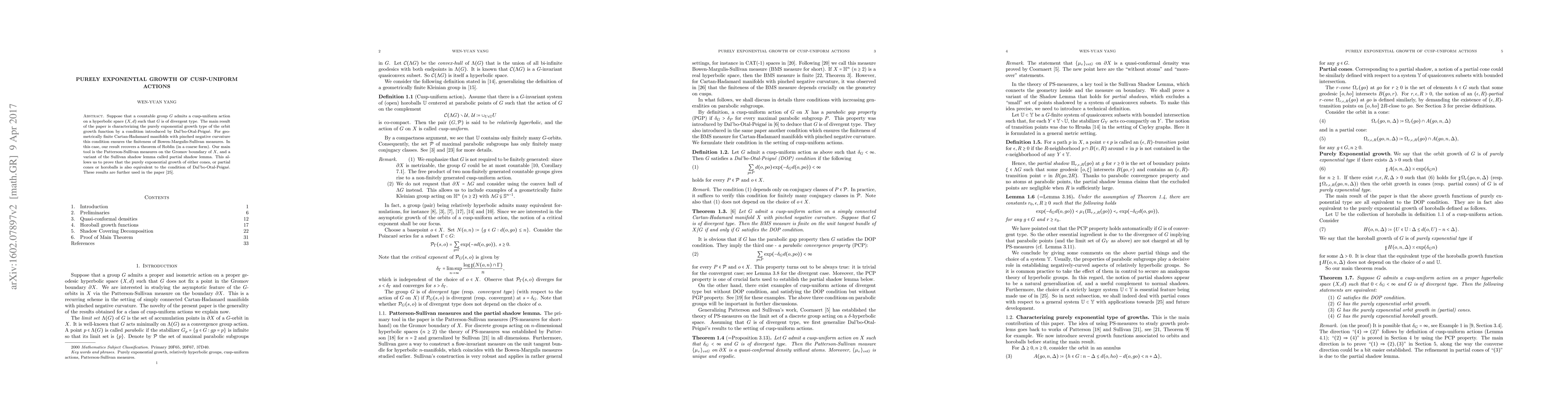 Suppose that a countable group $G$ admits a cusp-uniform action on a hyperbolic space $(X,d)$ such that $G$ is of divergent type. The main result of the paper is characterizing the purely exponential growth type of the orbit growth function by a condition introduced by Dal'bo-Otal-Peign\'e. For geometrically finite Cartan-Hadamard manifolds with pinched negative curvature this condition ensures the finiteness of Bowen-Margulis-Sullivan measures. In this case, our result recovers a theorem of Roblin (in a weaker form). Our main tool is the Patterson-Sullivan measures on the Gromov boundary of $X$, and a variant of the Sullivan shadow lemma called partial shadow lemma. This allows us to prove that the purely exponential growth of either cones, or partial cones or horoballs is also equivalent to the condition of Dal'bo-Otal-Peign\'e. These results are further used in the paper \cite{YANG7}.