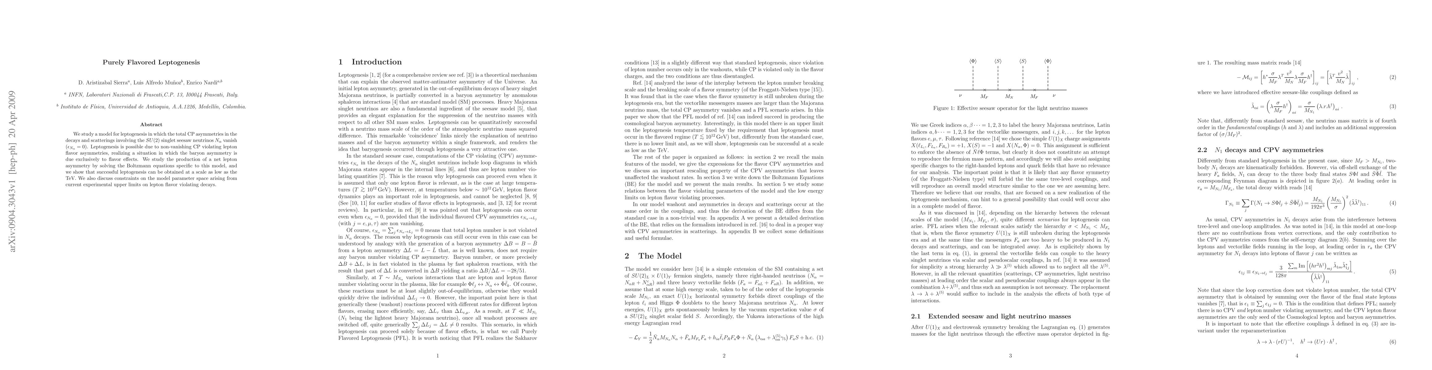 We study a model for leptogenesis in which the total CP asymmetries in the decays and scatterings involving the SU(2) singlet seesaw neutrinos $N_\alpha$ vanish ($\epsilon_{N_\alpha}=0$). Leptogenesis is possible due to non-vanishing CP violating lepton flavor asymmetries, realizing a situation in which the baryon asymmetry is due exclusively to flavor effects. We study the production of a net lepton asymmetry by solving the Boltzmann equations specific to this model, and we show that successful leptogenesis can be obtained at a scale as low as the TeV. We also discuss constraints on the model parameter space arising from current experimental upper limits on lepton flavor violating decays.