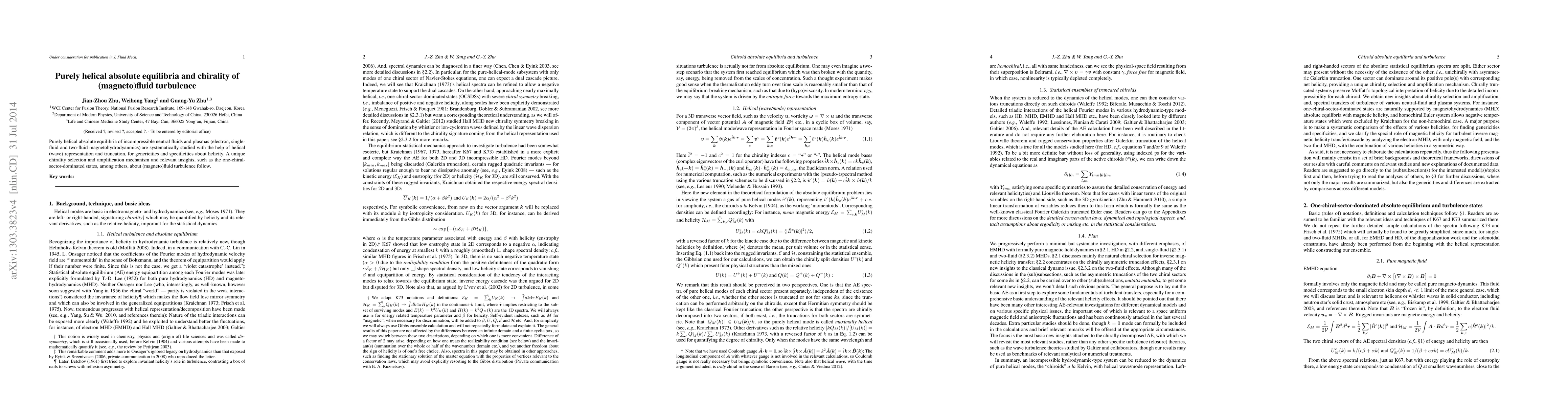 Left- and right-handed helical modes' statistical absolute equilibria appear \textit{separately}. If both chiral sectors present, one can dominate around its positive pole, which is relevant to the nearly maximally helical (force free for magnetic field) states of turbulence. Pure magnetodynamics (PMD, or electron magnetohydrodynamics --- EMHD), pure hydrodynamics (PHD), and, single-fluid and two-fluid MHDs are studied. Relevant documented data and issues of cascade properties, and, helical and nonhelical dynamos are revisited. We also discuss new scenarios, such as PMD inverse magnetic helicity and forward energy cascades, and, the continuous transition from completely-inverse to partly-inverse-and-partly-forward and to completely-forward energy transfers in PHD.