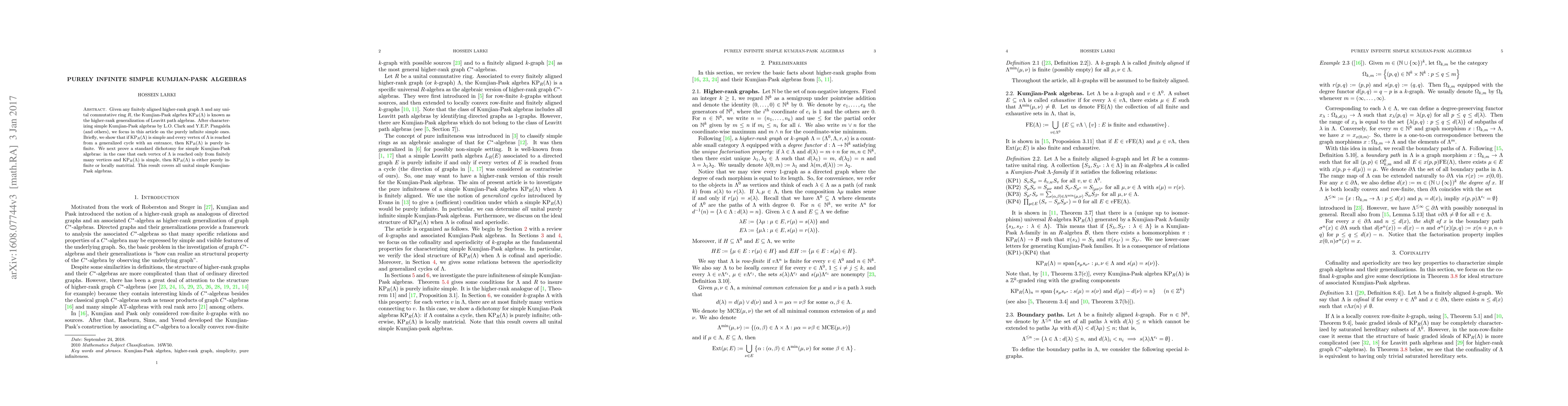 This paper investigates purely infinite simple Kumjian-Pask algebras, showing that under specific conditions on a higher-rank graph $\Lambda$, the corresponding algebra $\mathrm{KP}_R(\Lambda)$ is purely infinite. It also establishes a dichotomy for simple Kumjian-Pask algebras, categorizing them as either purely infinite or locally matricial.