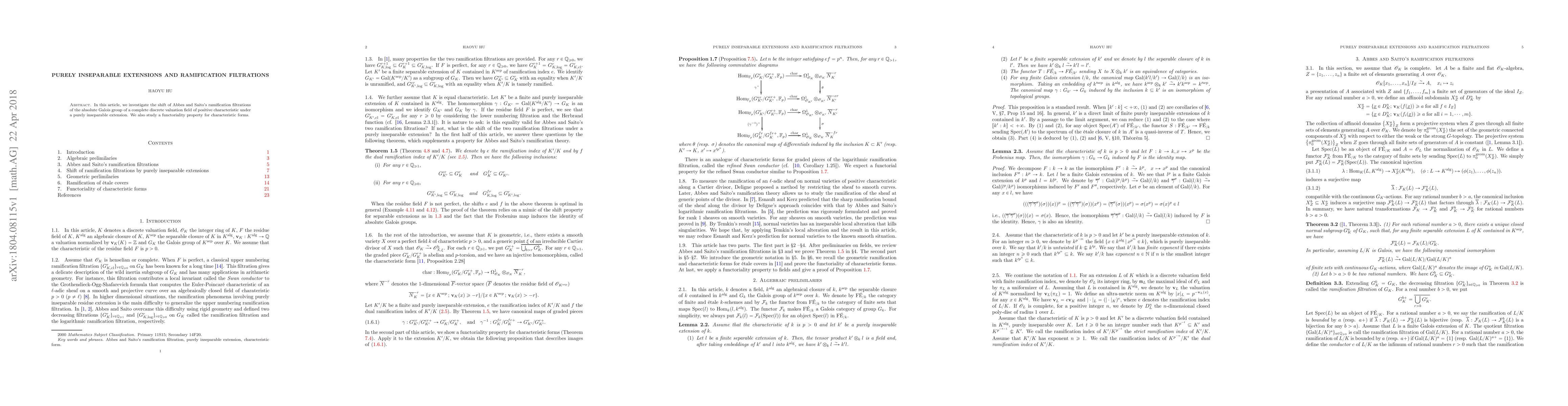 In this article, we investigate the shift of Abbes and Saito's ramification filtrations of the absolute Galois group of a complete discrete valuation field of positive characteristic under a purely inseparable extension. We also study a functoriality property for characteristic forms.