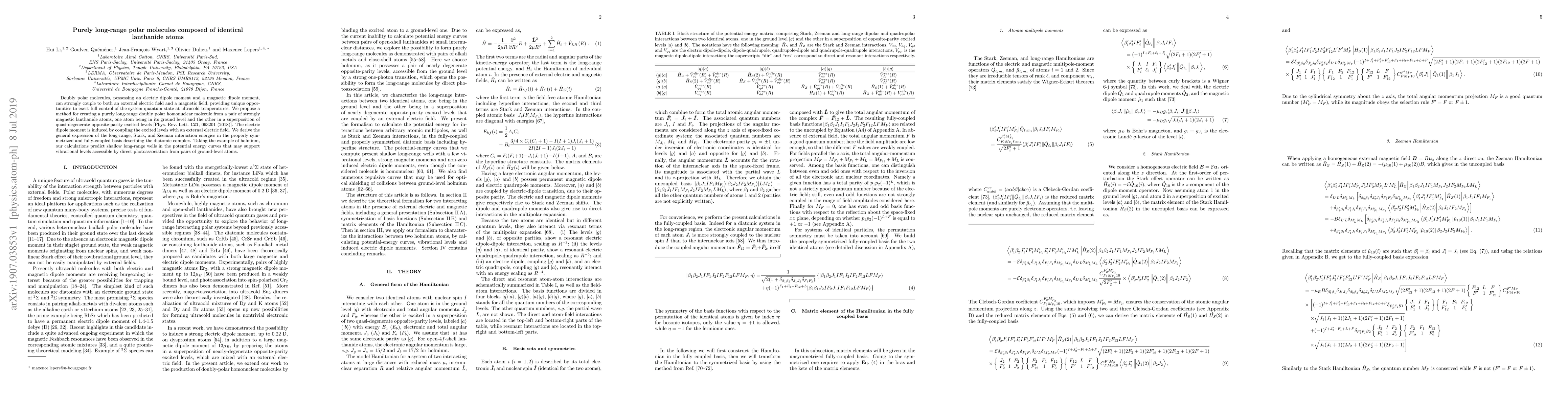 Doubly polar molecules, possessing an electric dipole moment and a magnetic dipole moment, can strongly couple to both an external electric field and a magnetic field, providing unique opportunities to exert full control of the system quantum state at ultracold temperatures. We propose a method for creating a purely long-range doubly polar homonuclear molecule from a pair of strongly magnetic lanthanide atoms, one atom being in its ground level and the other in a superposition of quasi-degenerate opposite-parity excited levels [Phys.~Rev.~Lett.~\textbf{121}, 063201 (2018)]. The electric dipole moment is induced by coupling the excited levels with an external electric field. We derive the general expression of the long-range, Stark, and Zeeman interaction energies in the properly symmetrized and fully-coupled basis describing the diatomic complex. Taking the example of holmium, our calculations predict shallow long-range wells in the potential energy curves that may support vibrational levels accessible by direct photoassociation from pairs of ground-level atoms.