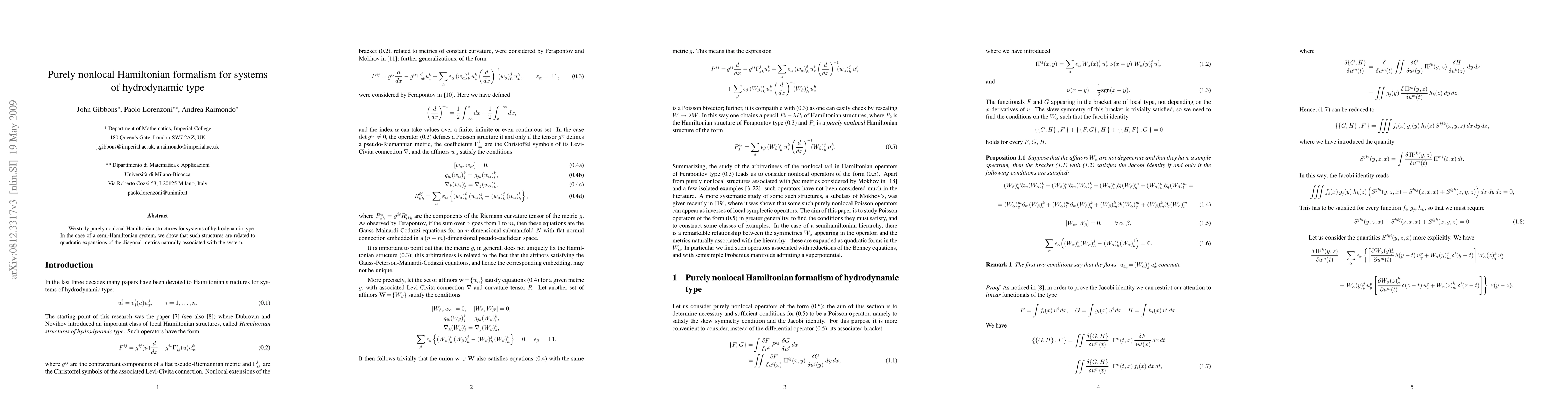 Summary: This paper explores nonlocal Hamiltonian frameworks for hydrodynamic systems, demonstrating their connection to quadratic expansions of diagonal metrics inherent to semi-Hamiltonian systems.