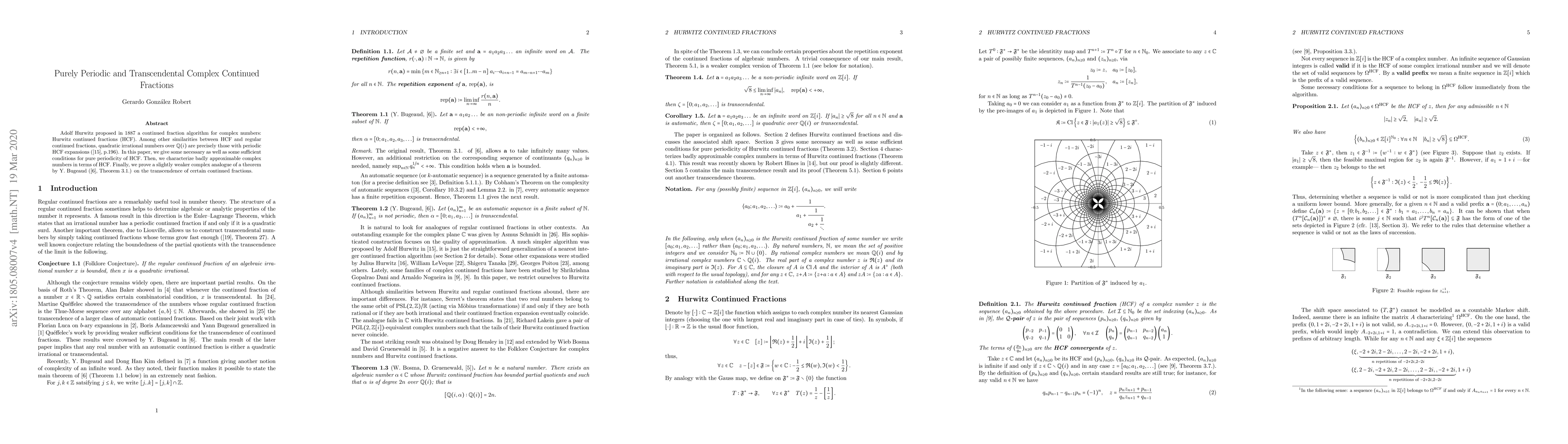 This paper investigates Hurwitz continued fractions (HCF) for complex numbers, identifying conditions for their pure periodicity and characterizing badly approximable complex numbers via HCF. It also proves a complex analogue of a theorem on the transcendence of certain continued fractions.