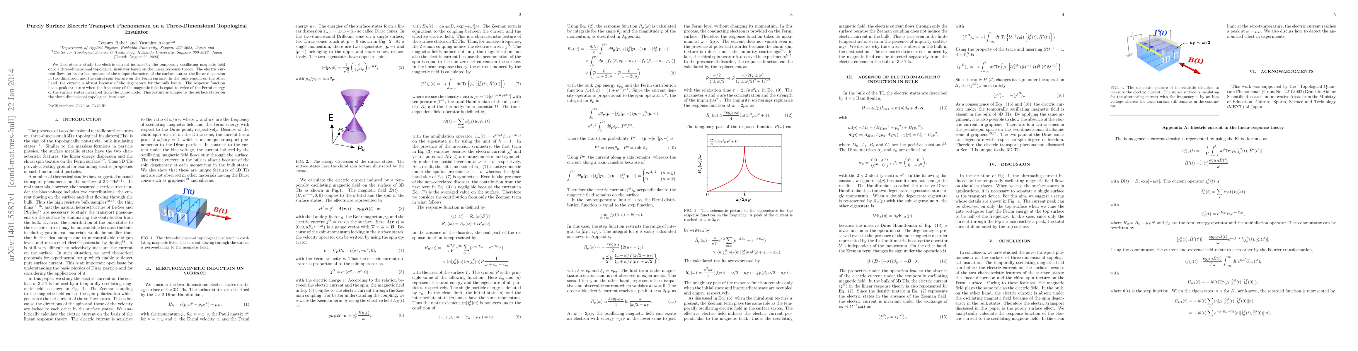 This paper theoretically investigates the electric current on the surface of a three-dimensional topological insulator driven by an oscillating magnetic field, revealing a purely surface transport phenomenon. The study highlights the unique linear dispersion and chiral spin texture of surface states, leading to a peak response at twice the Fermi energy frequency.