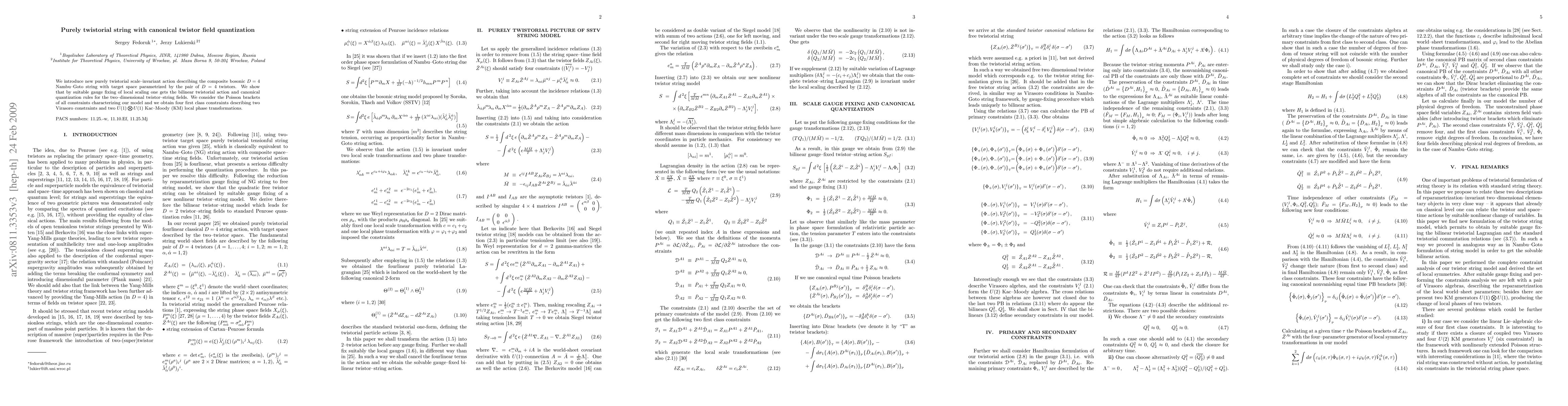 We introduce new purely twistorial scale-invariant action describing the composite bosonic D=4 Nambu-Goto string with target space parametrized by the pair of D=4 twistors. We show that by suitable gauge fixing of local scaling one gets the bilinear twistorial action and canonical quantization rules for the two-dimensional twistor-string fields. We consider the Poisson brackets of all constraints characterizing our model and we obtain four first class constraints describing two Virasoro constraints and two U(1)xU(1) Kac-Moody (KM) local phase transformations.