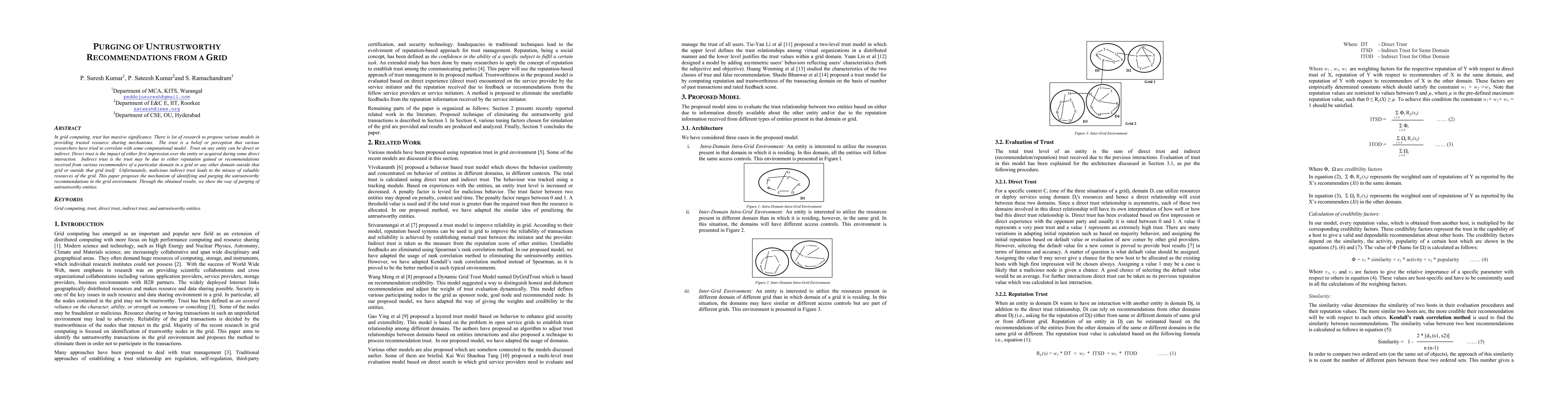 In grid computing, trust has massive significance. There is lot of research to propose various models in providing trusted resource sharing mechanisms. The trust is a belief or perception that various researchers have tried to correlate with some computational model. Trust on any entity can be direct or indirect. Direct trust is the impact of either first impression over the entity or acquired during some direct interaction. Indirect trust is the trust may be due to either reputation gained or recommendations received from various recommenders of a particular domain in a grid or any other domain outside that grid or outside that grid itself. Unfortunately, malicious indirect trust leads to the misuse of valuable resources of the grid. This paper proposes the mechanism of identifying and purging the untrustworthy recommendations in the grid environment. Through the obtained results, we show the way of purging of untrustworthy entities.