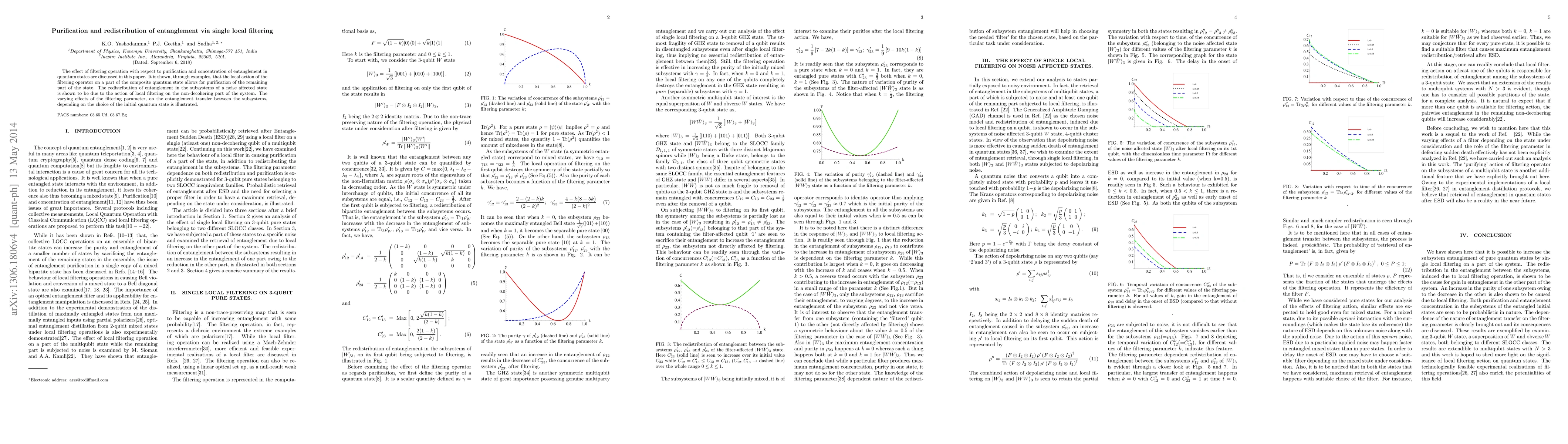 This paper explores how local filtering operations can purify and redistribute entanglement in composite quantum states, demonstrating that such actions can concentrate entanglement in one part of the system while affecting the entanglement distribution in the subsystems. The study highlights the dependence of entanglement transfer on the filtering parameter and the initial quantum state.