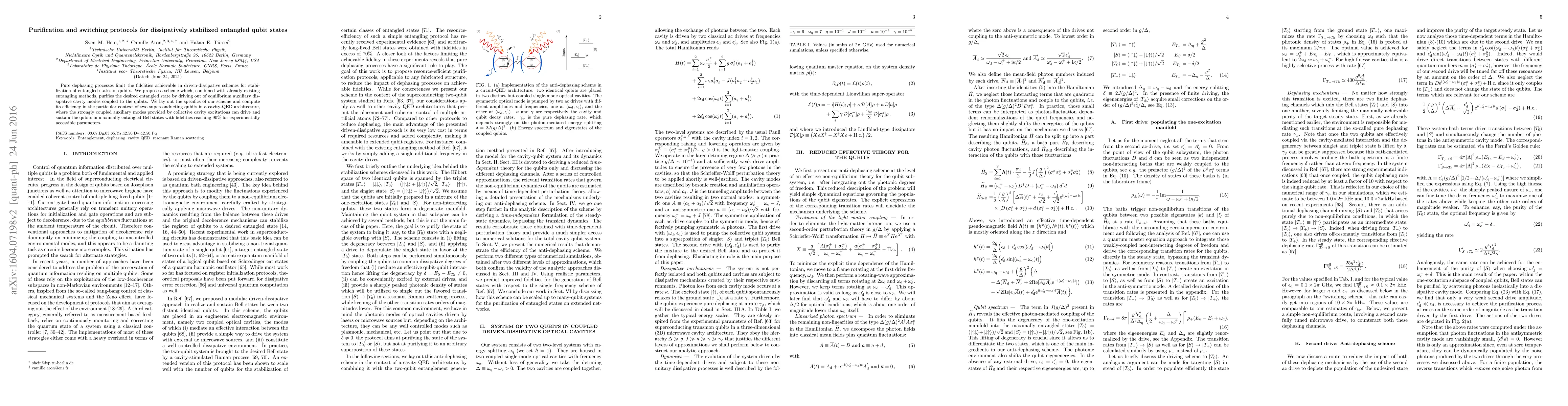Pure dephasing processes limit the fidelities achievable in driven-dissipative schemes for stabilization of entangled states of qubits. We propose a scheme which, combined with already existing entangling methods, purifies the desired entangled state by driving out of equilibrium auxiliary dissipative cavity modes coupled to the qubits. We lay out the specifics of our scheme and compute its efficiency in the particular context of two superconducting qubits in a cavity-QED architecture, where the strongly coupled auxiliary modes provided by collective cavity excitations can drive and sustain the qubits in maximally entangled Bell states with fidelities reaching 90% for experimentally accessible parameters.