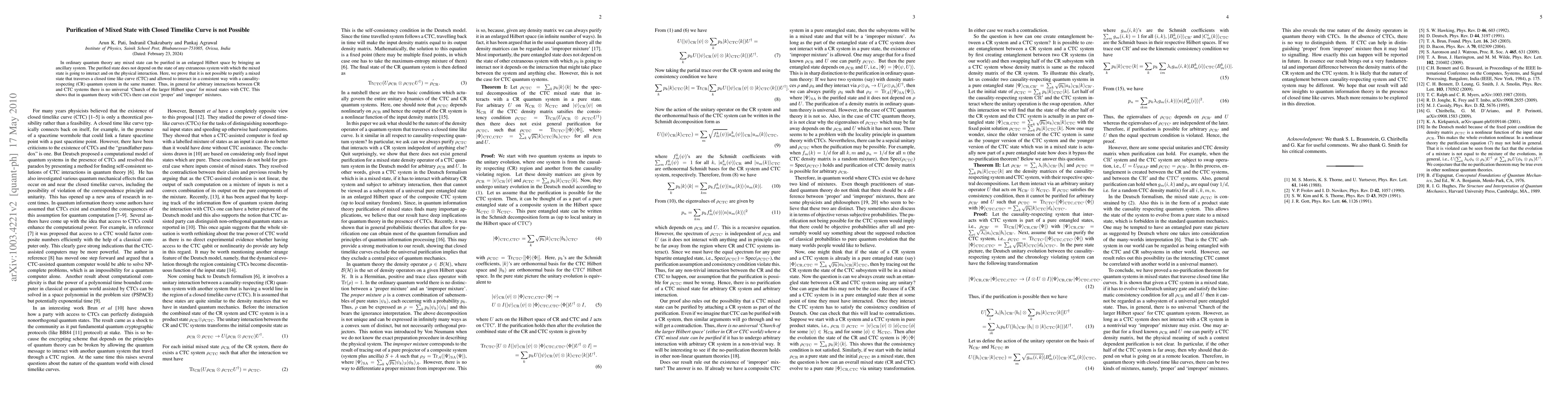 In ordinary quantum theory any mixed state can be purified in an enlarged Hilbert space by bringing an ancillary system. The purified state does not depend on the state of any extraneous system with which the mixed state is going to interact and on the physical interaction. Here, we prove that it is not possible to purify a mixed state that traverses a closed time like curve (CTC) and allowed to interact in a consistent way with a causality-respecting (CR) quantum system in the same manner. Thus, in general for arbitrary interactions between CR and CTC systems there is no universal 'Church of the larger Hilbert space' for mixed states with CTC. This shows that in quantum theory with CTCs there can exist 'proper' and 'improper' mixtures.