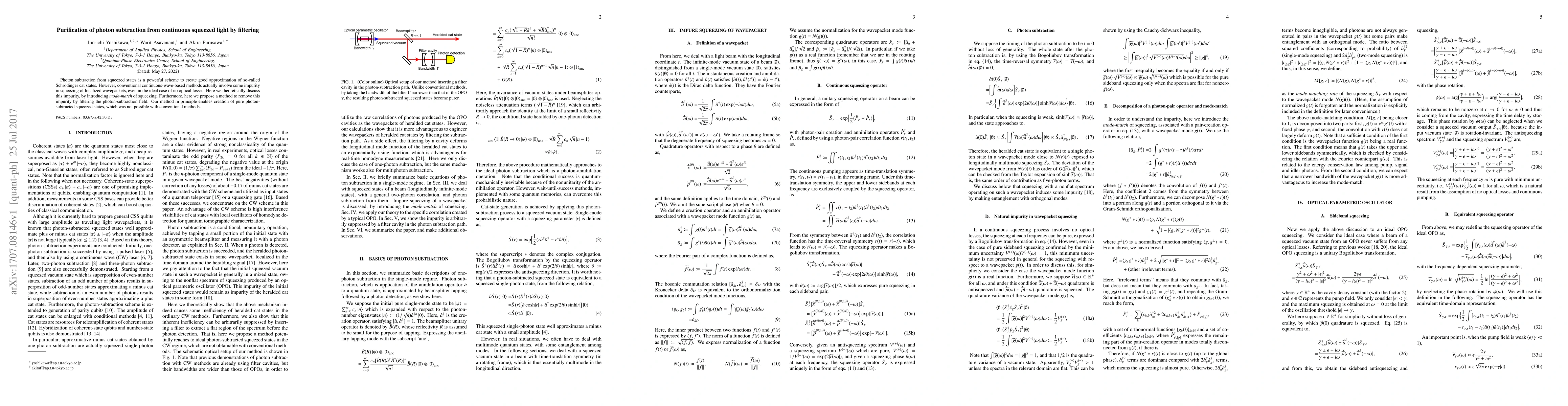 This paper proposes a method to purify photon subtraction from continuous squeezed light by filtering, addressing the impurity in squeezing of localized wavepackets that conventional methods introduce. The proposed filtering technique enables the creation of pure photon-subtracted squeezed states, overcoming limitations of existing methods.