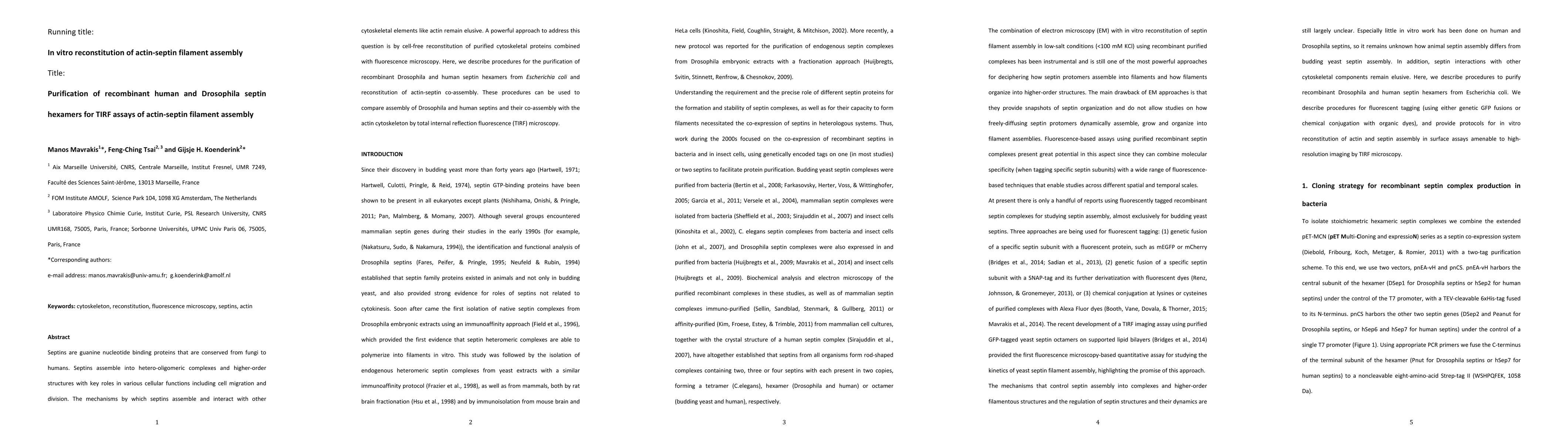 This paper details methods for purifying recombinant human and Drosophila septin hexamers from E. coli for TIRF microscopy studies. The aim is to understand the mechanisms of septin assembly and their interaction with actin through cell-free reconstitution and fluorescence microscopy.