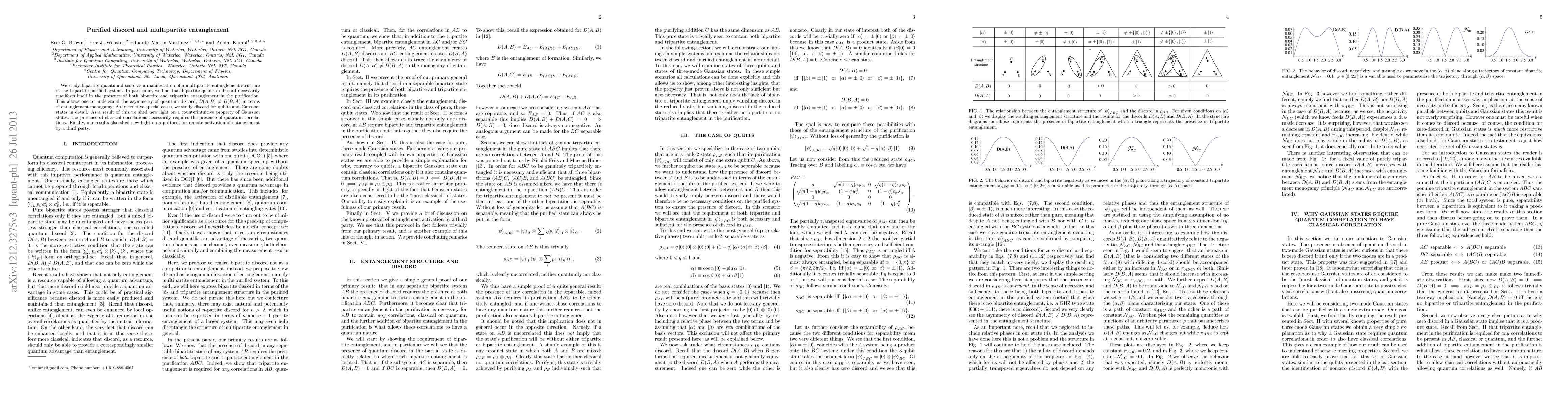 This paper investigates how bipartite quantum discord reveals multipartite entanglement in tripartite systems, showing that discord's asymmetry can be understood through entanglement monogamy. It highlights that classical correlations in Gaussian states inherently require quantum correlations, and it provides insights into protocols for remote entanglement activation.