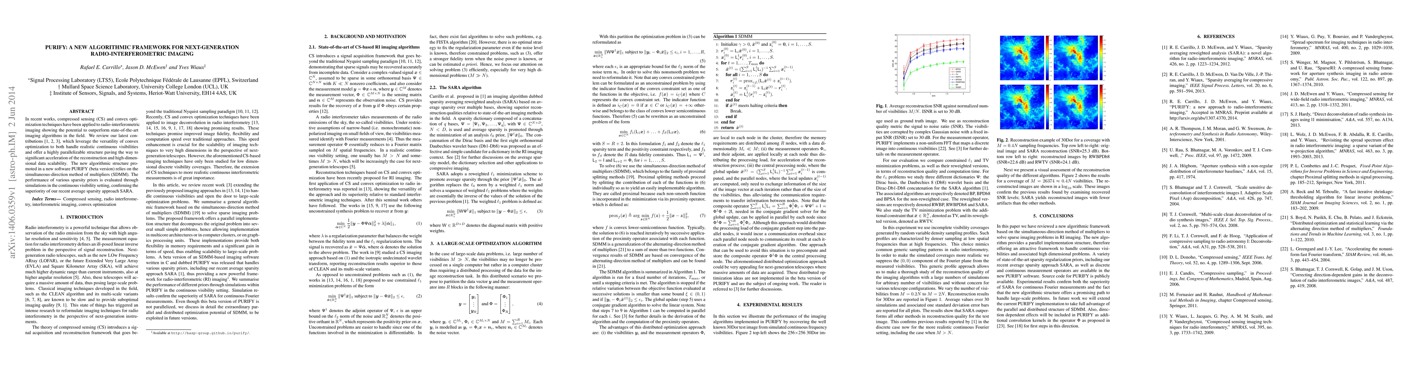 The PURIFY framework introduces a new algorithmic structure for next-generation radio-interferometric imaging, leveraging convex optimization and the SDMM for parallelizable, scalable reconstruction. Simulation results demonstrate the superiority of the proposed average sparsity approach SARA over existing methods.