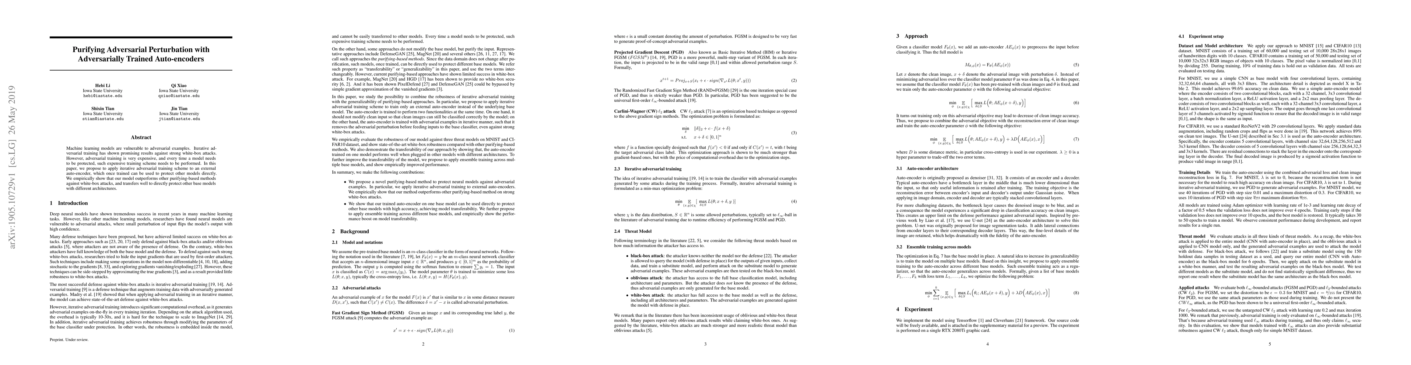 This paper proposes using adversarially trained auto-encoders to purify adversarial perturbations, enabling protection of other machine learning models against white-box attacks. The trained auto-encoder can directly safeguard different base models, outperforming other purifying methods and requiring less expensive iterative adversarial training.
