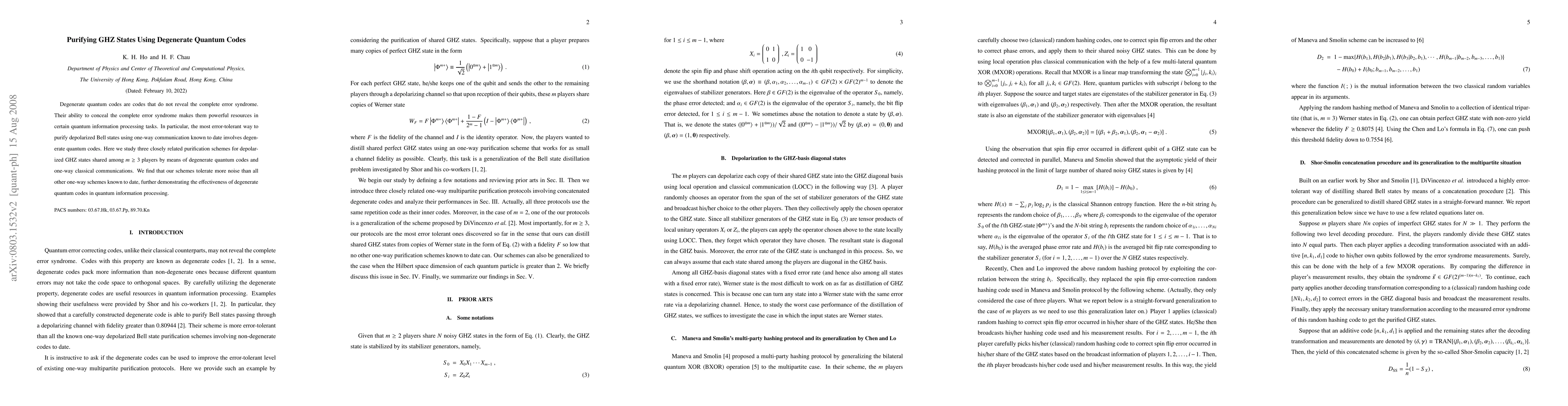 The paper presents a novel approach to purify GHZ states using degenerate quantum codes, extending existing protocols for Bell states and demonstrating improved noise tolerance.