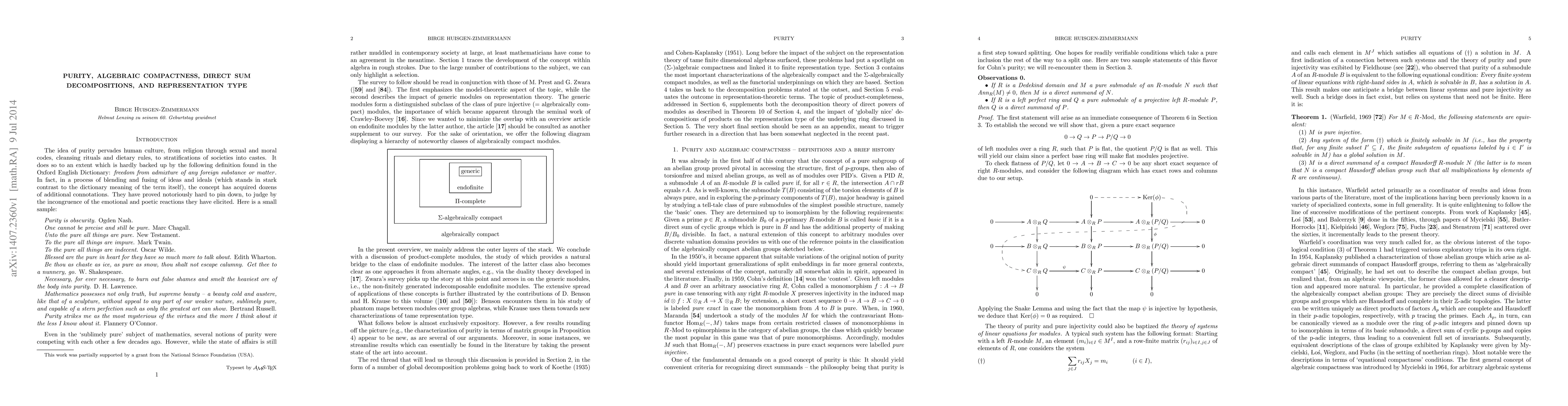 This survey article is devoted to the notions of purity, algebraic and $\Sigma$-algebraic compactness, direct sum decompositions, and representation type in the category of modules over a ring. It begins with basic definitions, a brief history, and a discussion of global decomposition problems going back to work of K\"othe and Cohen-Kaplansky; these are strongly tied to algebraic compactness. Characterisations of ($\Sigma$-)algebraically compact modules are presented, as well as the functorial underpinnings on which they are based. In particular, product-compatible functors, matrix functors and $p$-functors are discussed. The latter part of the article is devoted to rings of vanishing left pure global dimension, product completeness, endofiniteness, the pure semisimplicity problem and its connection with a strong Artin problem on division ring extensions.