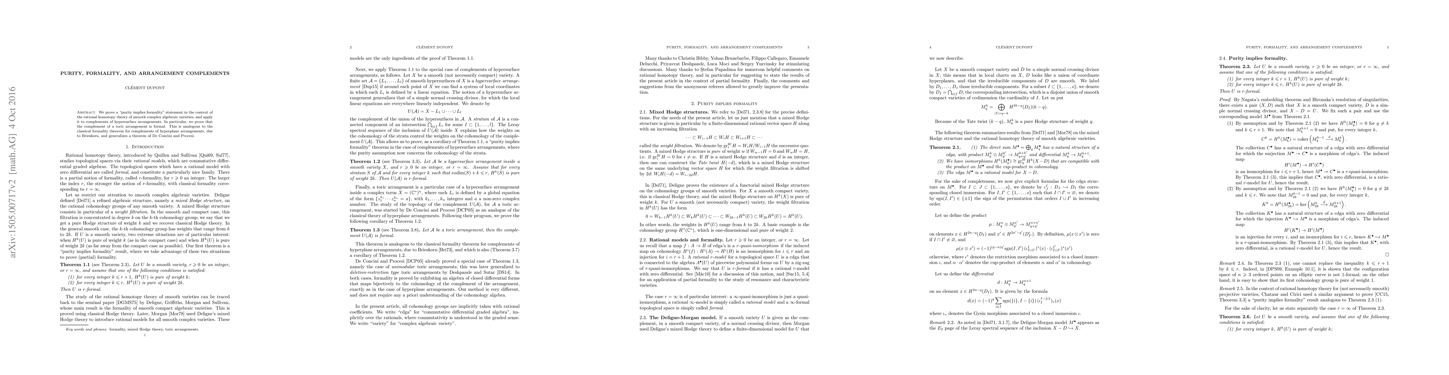 The paper proves that purity in rational homotopy theory implies formality, specifically showing that the complement of a toric arrangement is formal, generalizing classical results for hyperplane arrangements. This extends prior work by De Concini and Procesi.