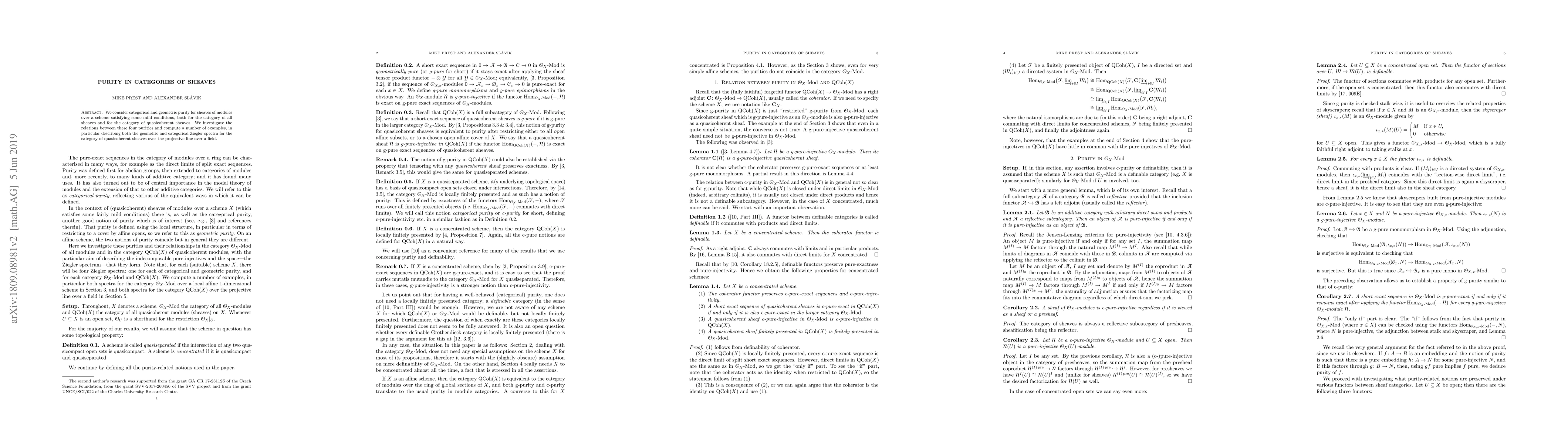 We consider categorical and geometric purity for sheaves of modules over a scheme satisfying some mild conditions, both for the category of all sheaves and for the category of quasicoherent sheaves. We investigate the relations between these four purities and compute a number of examples, in particular describing both the geometric and categorical Ziegler spectra for the category of quasicoherent sheaves over the projective line over a field.