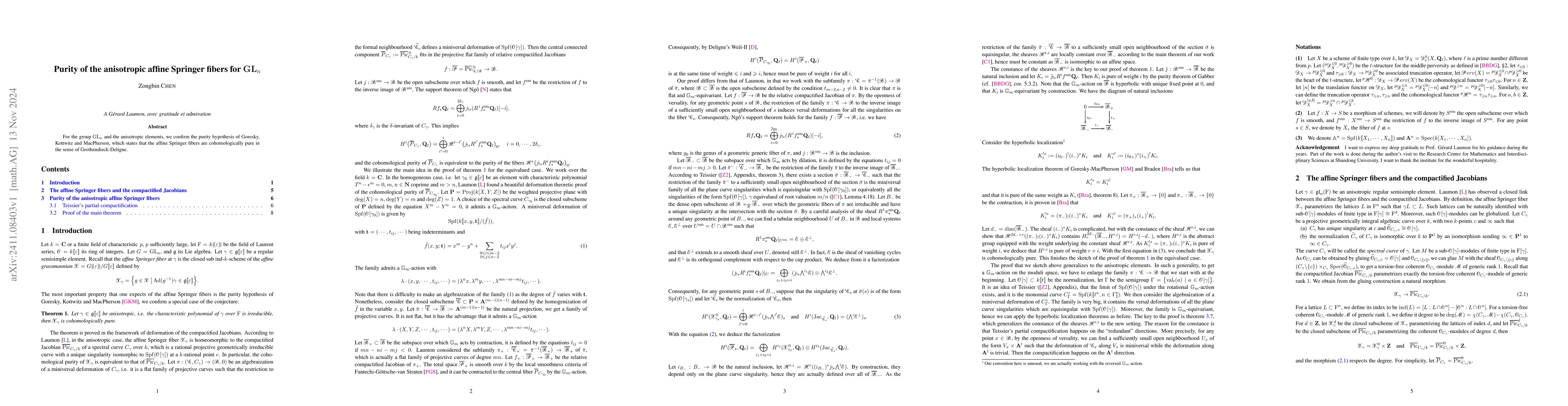 The paper confirms the purity hypothesis for anisotropic affine Springer fibers of $\mathrm{GL}_{n}$, demonstrating that these fibers satisfy the cohomological purity condition as proposed by Goresky, Kottwitz, and MacPherson. This supports the structural properties of these fibers in representation theory.