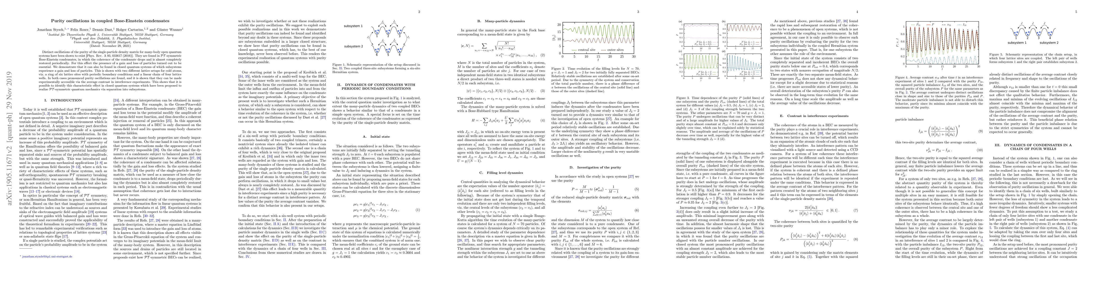 It is shown that the distinct oscillations of the purity of the single-particle density matrix for many-body open quantum systems with balanced gain and loss reported by Dast et al. [Phys. Rev. A 93, 033617 (2016)] can also be found in closed quantum systems of which subsystems experience a gain and loss of particles. This is demonstrated with two different lattice setups for cold atoms, viz. a ring of six lattice sites with periodic boundary conditions and a linear chain of four lattice wells. In both cases pronounced purity oscillations are found, and it is shown that they can be made experimentally accessible via the average contrast in interference experiments.