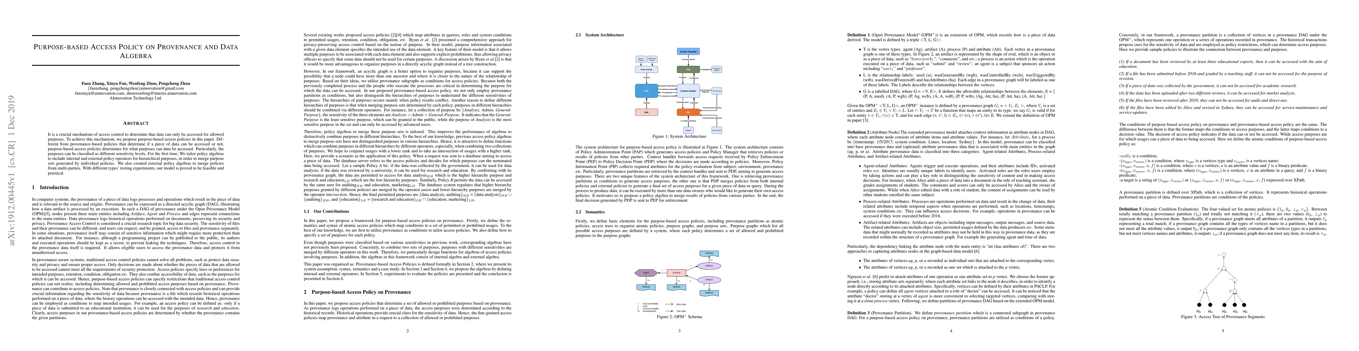 This paper proposes purpose-based access policies to control data access according to allowed purposes, distinguishing them from provenance-based policies. It introduces tailored policy algebras for merging purpose sets and multi-party policies, demonstrating feasibility and practicality through experiments.