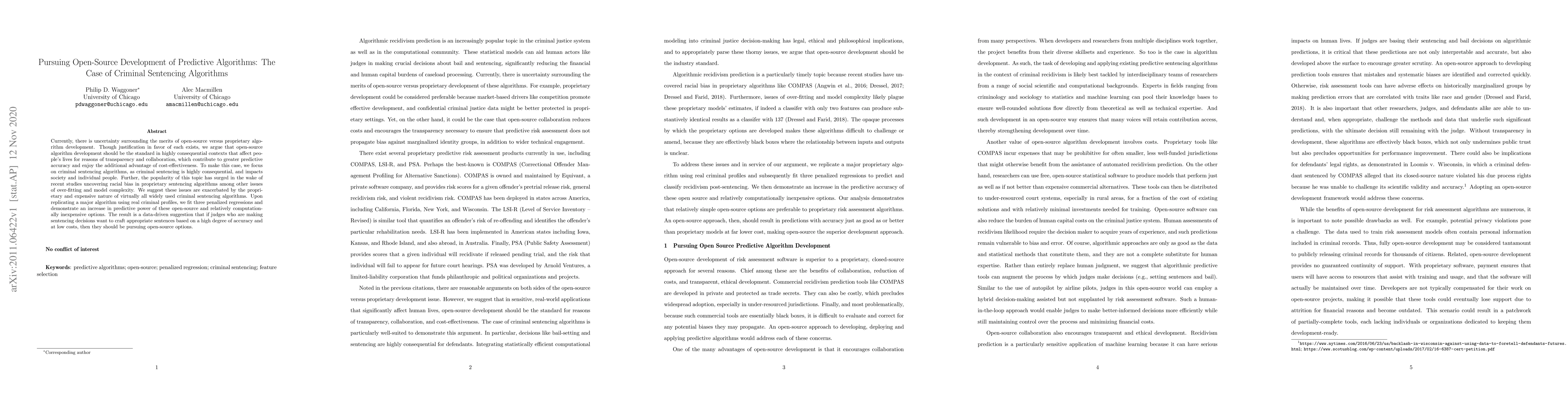 The paper advocates for open-source development of criminal sentencing algorithms due to transparency, collaboration, and cost-effectiveness. Replicating a major algorithm, the authors demonstrate increased predictive power and lower costs with open-source options, suggesting judges should prioritize these for accurate, affordable sentencing.
