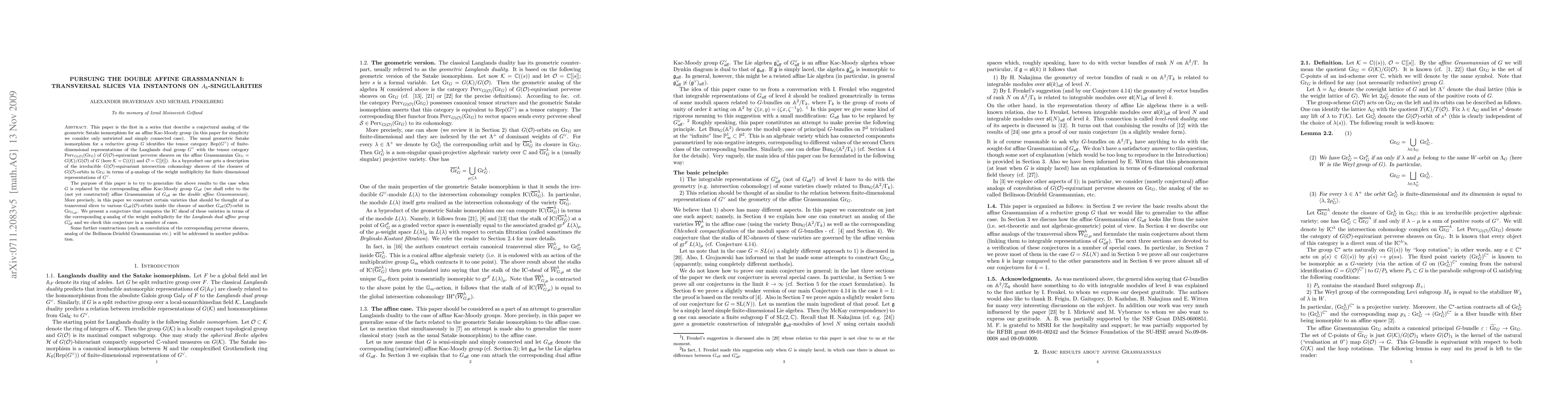 This paper is the first in a series that describe a conjectural analog of the geometric Satake isomorphism for an affine Kac-Moody group. In this paper we construct a model for the singularities of some would-be Schubert varieties in the affine Grassmannian for an affine Kac-Moody group. We formulate a conjecture describing the (local) intersection cohomology of these varieties in terms of integrable representations of the Langlands dual affine Kac-Moody group and check this conjecture in a number of cases. Roughly speaking the above singularities are constructed by looking at the Uhlenbeck space of instantons on the quotient of the affine plane by a finite cyclic subgroup of SL(2).