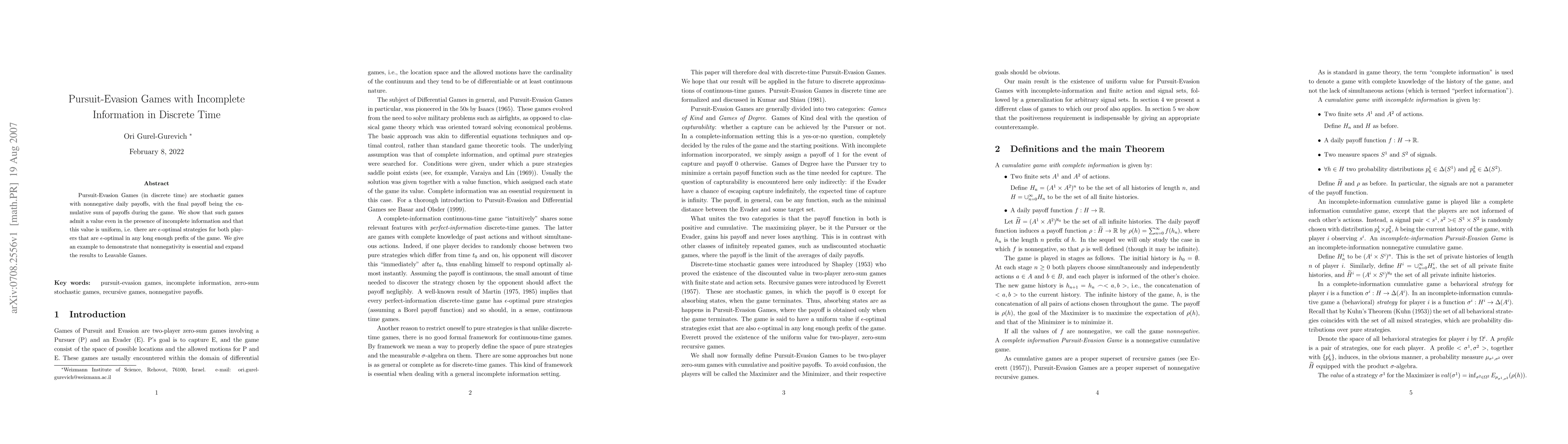 This paper demonstrates that pursuit-evasion games in discrete time, even with incomplete information, have a uniform value, meaning both players can find epsilon-optimal strategies that work well over long game segments. The authors highlight the necessity of nonnegativity in these results and extend the findings to leavable games.