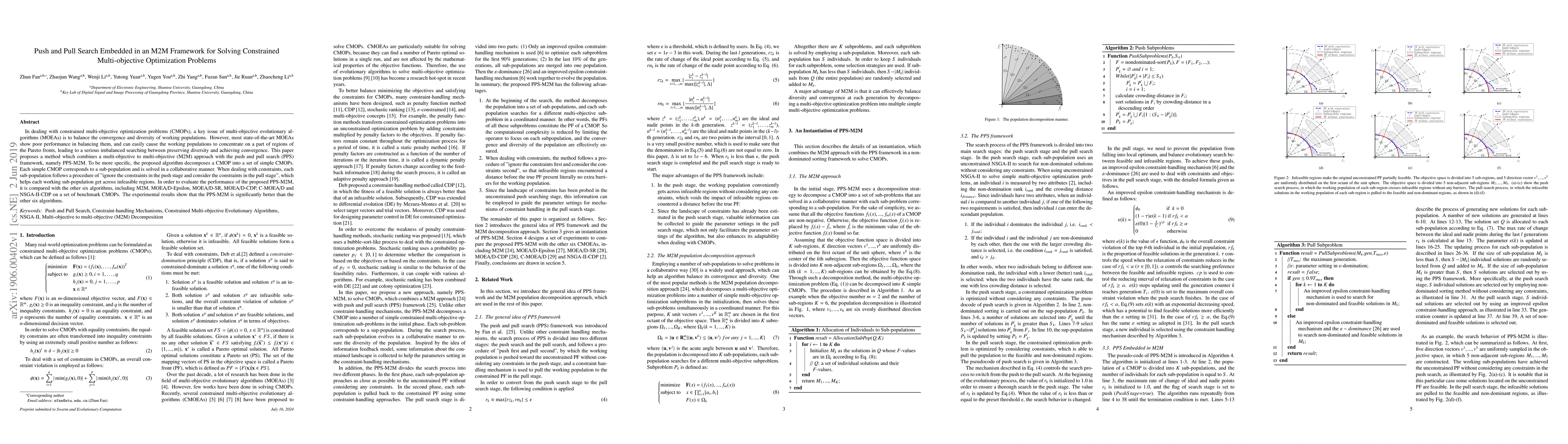 Summary: This paper proposes a push and pull search embedded in a machine-to-machine (M2M) framework to address constrained multi-objective optimization problems (CMOPs) by balancing convergence and diversity in multi-objective evolutionary algorithms (MOEAs). The approach aims to enhance the performance of MOEAs in finding optimal solutions.