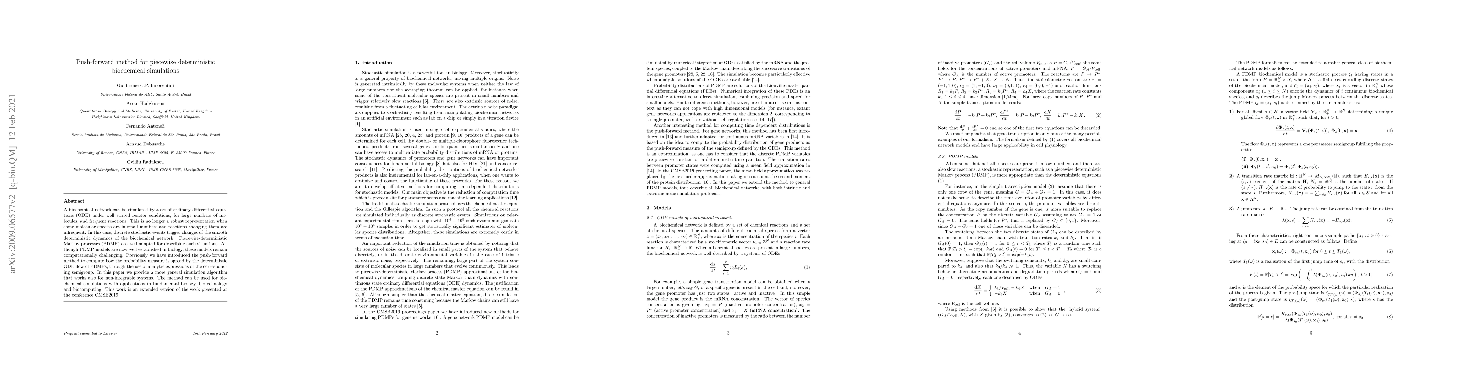 A biochemical network can be simulated by a set of ordinary differential equations (ODE) under well stirred reactor conditions, for large numbers of molecules, and frequent reactions. This is no longer a robust representation when some molecular species are in small numbers and reactions changing them are infrequent. In this case, discrete stochastic events trigger changes of the smooth deterministic dynamics of the biochemical network. Piecewise-deterministic Markov processes (PDMP) are well adapted for describing such situations. Although PDMP models are now well established in biology, these models remain computationally challenging. Previously we have introduced the push-forward method to compute how the probability measure is spread by the deterministic ODE flow of PDMPs, through the use of analytic expressions of the corresponding semigroup. In this paper we provide a more general simulation algorithm that works also for non-integrable systems. The method can be used for biochemical simulations with applications in fundamental biology, biotechnology and biocomputing.This work is an extended version of the work presented at the conference CMSB2019.