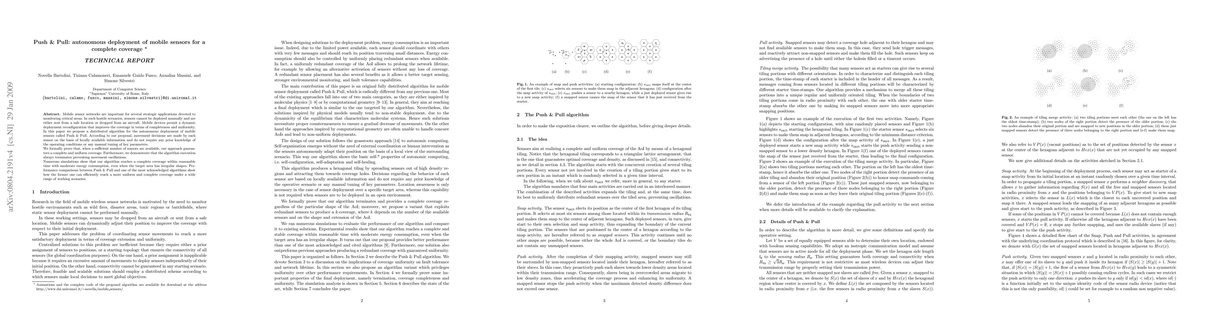 This paper proposes a distributed algorithm named Push&Pull for autonomous deployment of mobile sensors to achieve complete and uniform coverage in hostile environments. The algorithm guarantees complete coverage with minimal energy and avoids movement oscillations, outperforming existing methods in simulations.