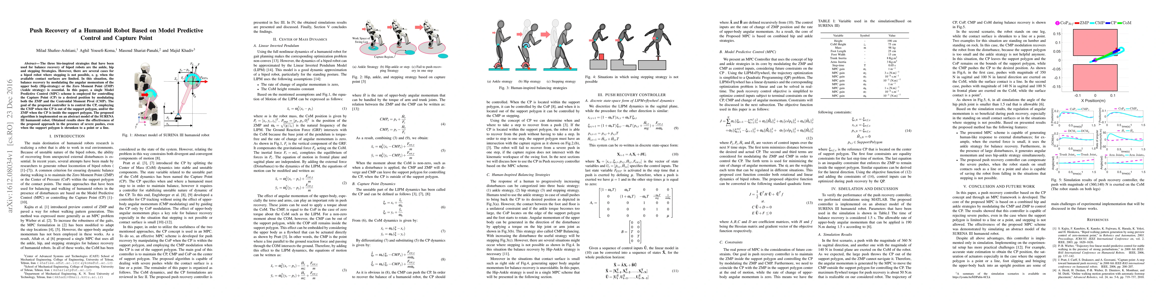 The three bio-inspired strategies that have been used for balance recovery of biped robots are the ankle, hip and stepping Strategies. However, there are several cases for a biped robot where stepping is not possible, e. g. when the available contact surfaces are limited. In this situation, the balance recovery by modulating the angular momentum of the upper body (Hip-strategy) or the Zero Moment Point (ZMP) (Ankle strategy) is essential. In this paper, a single Model Predictive Control (MPC) scheme is employed for controlling the Capture Point (CP) to a desired position by modulating both the ZMP and the Centroidal Moment Pivot (CMP). The goal of the proposed controller is to control the CP, employing the CMP when the CP is out of the support polygon, and/or the ZMP when the CP is inside the support polygon. The proposed algorithm is implemented on an abstract model of the SURENA III humanoid robot. Obtained results show the effectiveness of the proposed approach in the presence of severe pushes, even when the support polygon is shrunken to a point or a line.