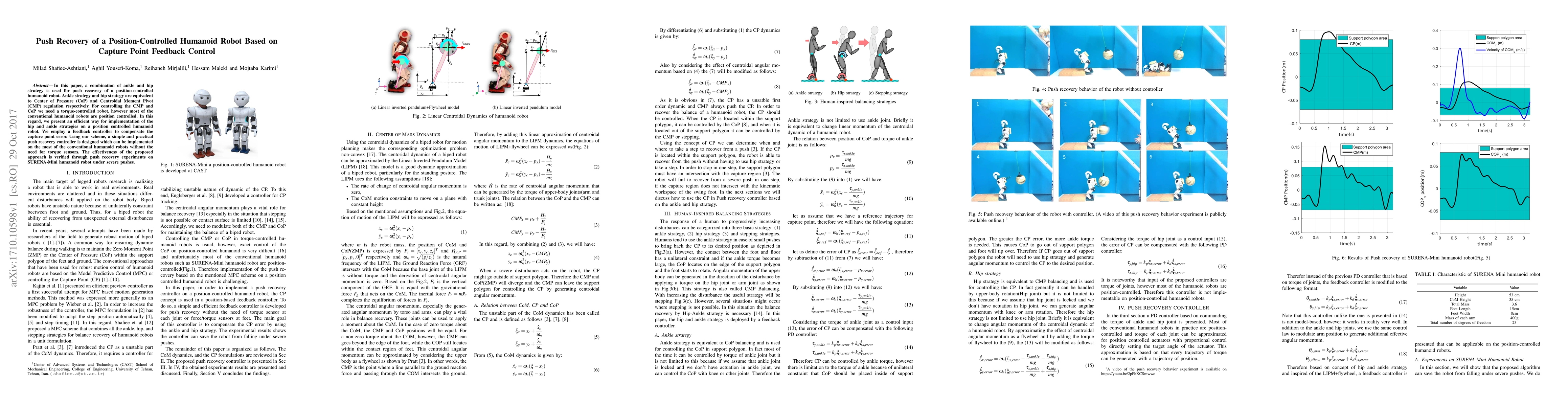 This paper proposes a method for push recovery in position-controlled humanoid robots using ankle and hip strategies, equivalent to CoP and CMP regulation, implemented via a feedback controller without requiring torque sensors. The effectiveness is demonstrated through experiments on the SURENA-Mini humanoid robot under severe pushes.