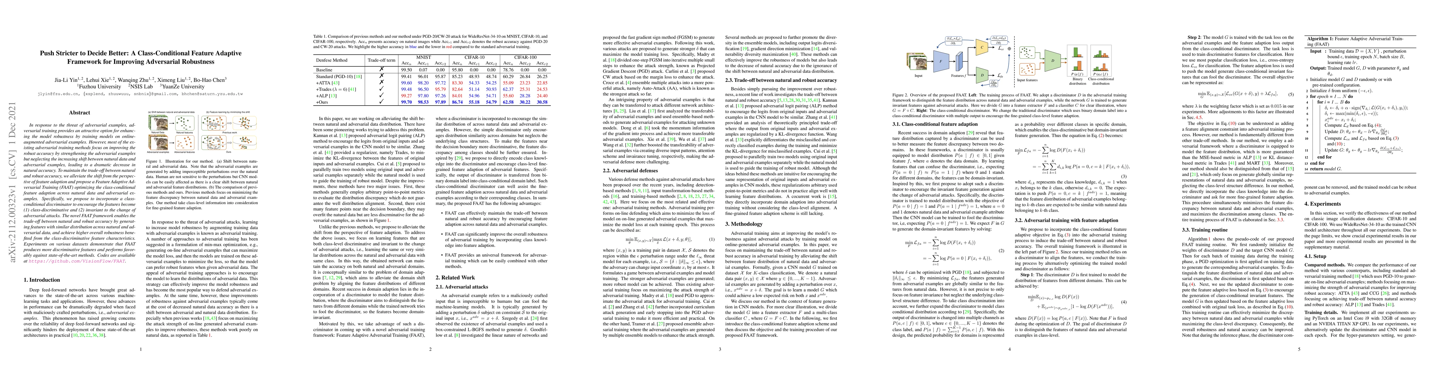 This paper proposes a Feature Adaptive Adversarial Training (FAAT) framework to improve adversarial robustness by balancing natural and robust accuracy through class-conditional feature adaptation. The FAAT framework incorporates a class-conditional discriminator to generate class-discriminative and attack-invariant features, achieving higher overall robustness.