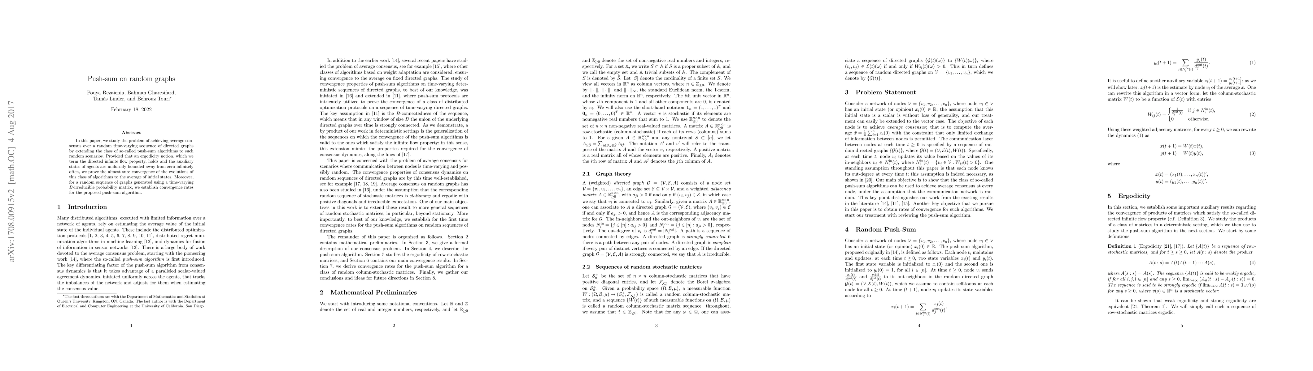 This paper extends push-sum algorithms to achieve average consensus over random time-varying directed graphs, proving almost sure convergence under the directed infinite flow property and bounded auxiliary states. It also establishes convergence rates for a specific random graph sequence generated by a B-irreducible probability matrix.