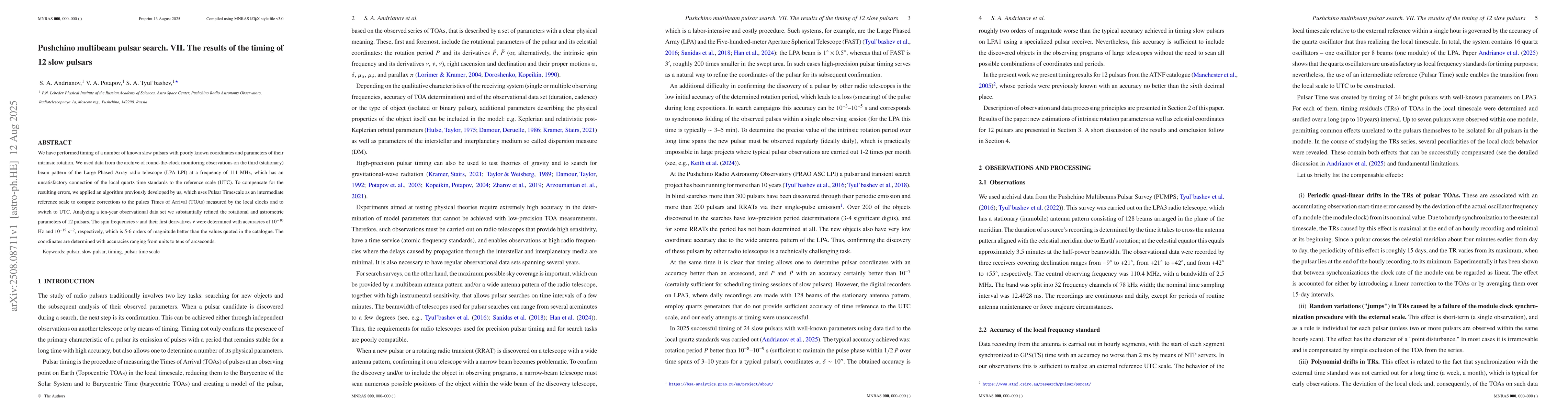 We have performed timing of a number of known slow pulsars with poorly known coordinates and parameters of their intrinsic rotation. We used data from the archive of round-the-clock monitoring observations on the third (stationary) beam pattern of the Large Phased Array radio telescope (LPA LPI) at a frequency of 111 MHz, which has an unsatisfactory connection of the local quartz time standards to the reference scale (UTC). To compensate for the resulting errors, we applied an algorithm previously developed by us, which uses Pulsar Timescale as an intermediate reference scale to compute corrections to the pulses Times of Arrival (TOAs) measured by the local clocks and to switch to UTC. Analyzing a ten-year observational data set we substantially refined the rotational and astrometric parameters of 12 pulsars. The spin frequencies $\nu$ and their first derivatives $\dot\nu$ were determined with accuracies of $10^{-10}$ Hz and $10^{-19}$ s$^{-2}$, respectively, which is 5-6 orders of magnitude better than the values quoted in the catalogue. The coordinates are determined with accuracies ranging from units to tens of arcseconds.