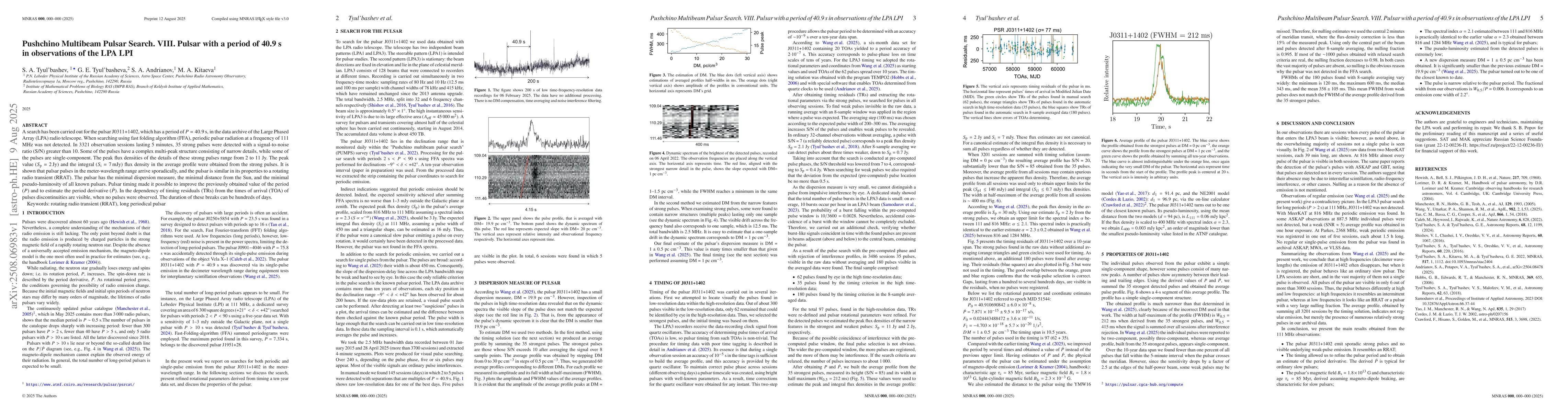 A search has been carried out for the pulsar J0311+1402, which has a period of $P = 40.9$ s, in the data archive of the Large Phased Array (LPA) radio telescope. When searching using fast folding algorithm (FFA), periodic pulsar radiation at a frequency of 111 MHz was not detected. In 3321 observation sessions lasting 5 minutes, 35 strong pulses were detected with a signal-to-noise ratio (S/N) greater than 10. Some of the pulses have a complex multi-peak structure consisting of narrow details, while some of the pulses are single-component. The peak flux densities of the details of these strong pulses range from 2 to 11 Jy. The peak value ($S_{\rm p} = 2$\,Jy) and the integral ($S_{\rm i} = 7$\,mJy) flux density in the average profile were obtained from the strong pulses. It is shown that pulsar pulses in the meter-wavelength range arrive sporadically, and the pulsar is similar in its properties to a rotating radio transient (RRAT). The pulsar has the minimal dispersion measure, the minimal distance from the Sun, and the minimal pseudo-luminosity of all known pulsars. Pulsar timing made it possible to improve the previously obtained value of the period ($P$) and to estimate the period derivative ($\dot P$). In the dependency of timing residuals (TRs) from the times of arrival (TOA) of pulses discontinuities are visible, when no pulses were observed. The duration of these breaks can be hundreds of days.