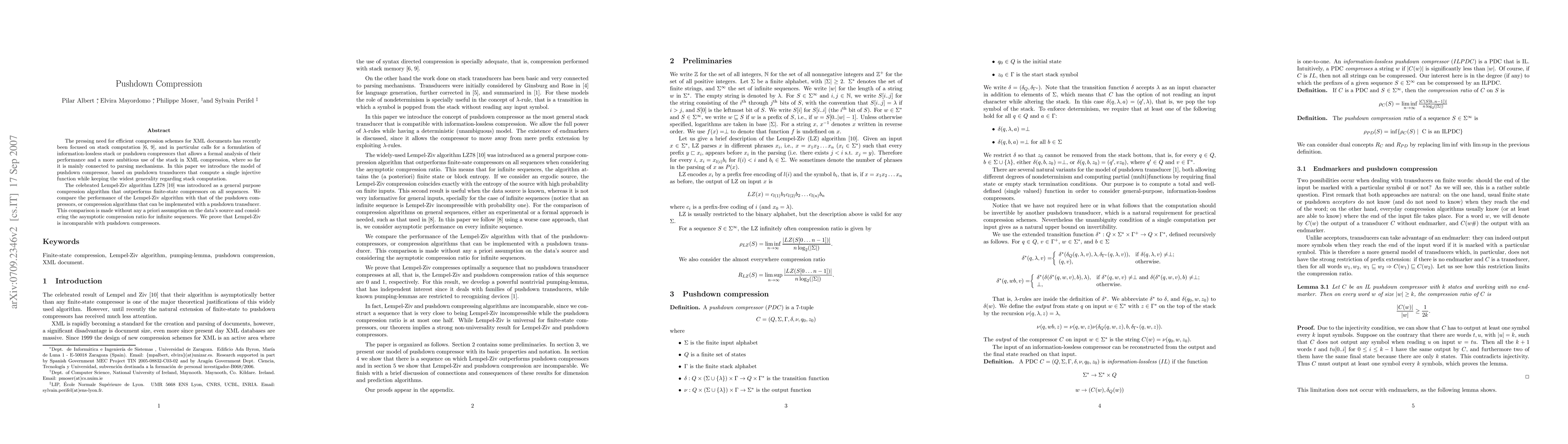 This paper introduces a pushdown compressor model based on pushdown transducers and compares its performance to the Lempel-Ziv LZ78 algorithm, showing that they are incomparable in terms of asymptotic compression ratio for infinite sequences without assumptions about the data source.
