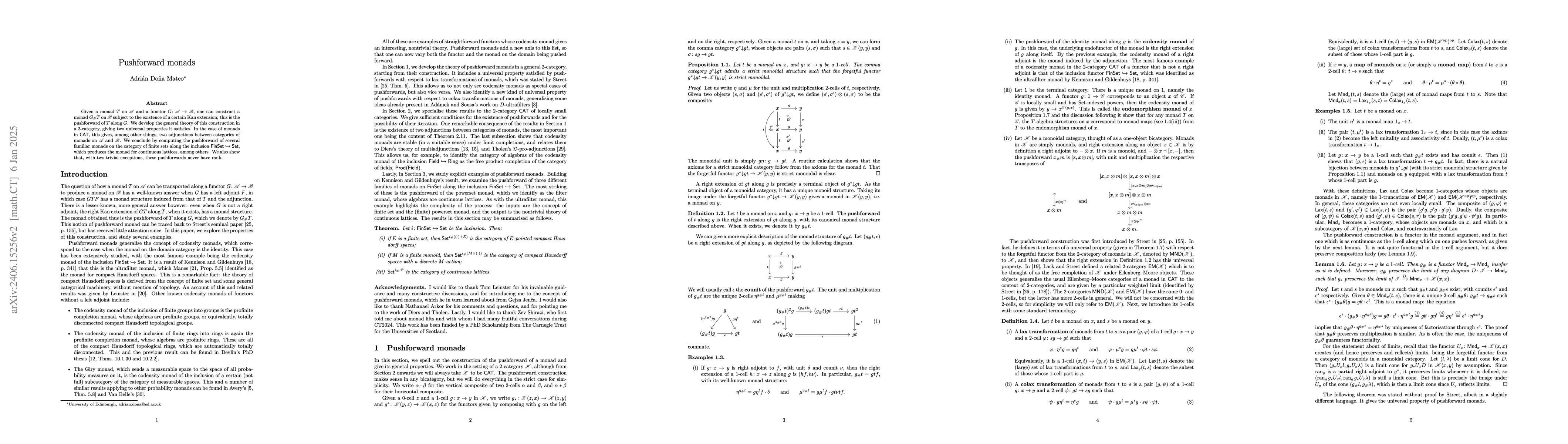 This paper develops the theory of pushforward monads, constructing them via functors and Kan extensions. It connects pushforward monads to codensity monads, providing examples such as the pushforward of the powerset monad yielding continuous lattices and the codensity monad of field inclusion into rings representing free product completions.