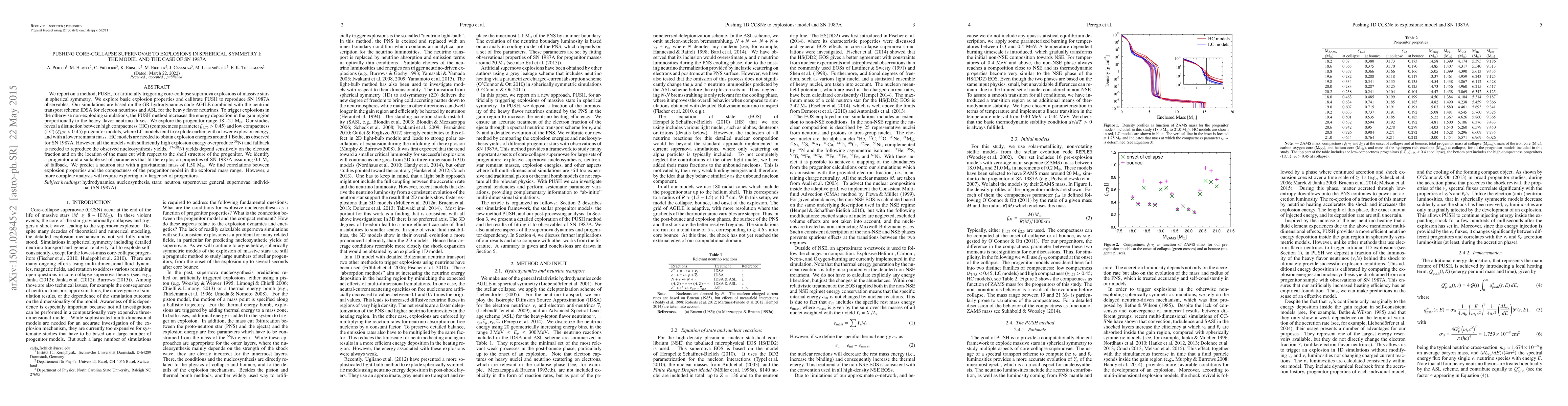 We report on a method, PUSH, for triggering core-collapse supernova explosions of massive stars in spherical symmetry. We explore basic explosion properties and calibrate PUSH such that the observables of SN1987A are reproduced. Our simulations are based on the general relativistic hydrodynamics code AGILE combined with the detailed neutrino transport scheme IDSA for electron neutrinos and ALS for the muon and tau neutrinos. To trigger explosions in the otherwise non-exploding simulations, we rely on the neutrino-driven mechanism. The PUSH method locally increases the energy deposition in the gain region through energy deposition by the heavy neutrino flavors. Our setup allows us to model the explosion for several seconds after core bounce. We explore the progenitor range 18-21M$_{\odot}$. Our studies reveal a distinction between high compactness (HC) and low compactness (LC) progenitor models, where LC models tend to explore earlier, with a lower explosion energy, and with a lower remnant mass. HC models are needed to obtain explosion energies around 1 Bethe, as observed for SN1987A. However, all the models with sufficiently high explosion energy overproduce $^{56}$Ni. We conclude that fallback is needed to reproduce the observed nucleosynthesis yields. The nucleosynthesis yields of $^{57-58}$Ni depend sensitively on the electron fraction and on the location of the mass cut with respect to the initial shell structure of the progenitor star. We identify a progenitor and a suitable set of PUSH parameters that fit the explosion properties of SN1987A when assuming 0.1M$_{\odot}$ of fallback. We predict a neutron star with a gravitational mass of 1.50M$_{\odot}$. We find correlations between explosion properties and the compactness of the progenitor model in the explored progenitors. However, a more complete analysis will require the exploration of a larger set of progenitors with PUSH.